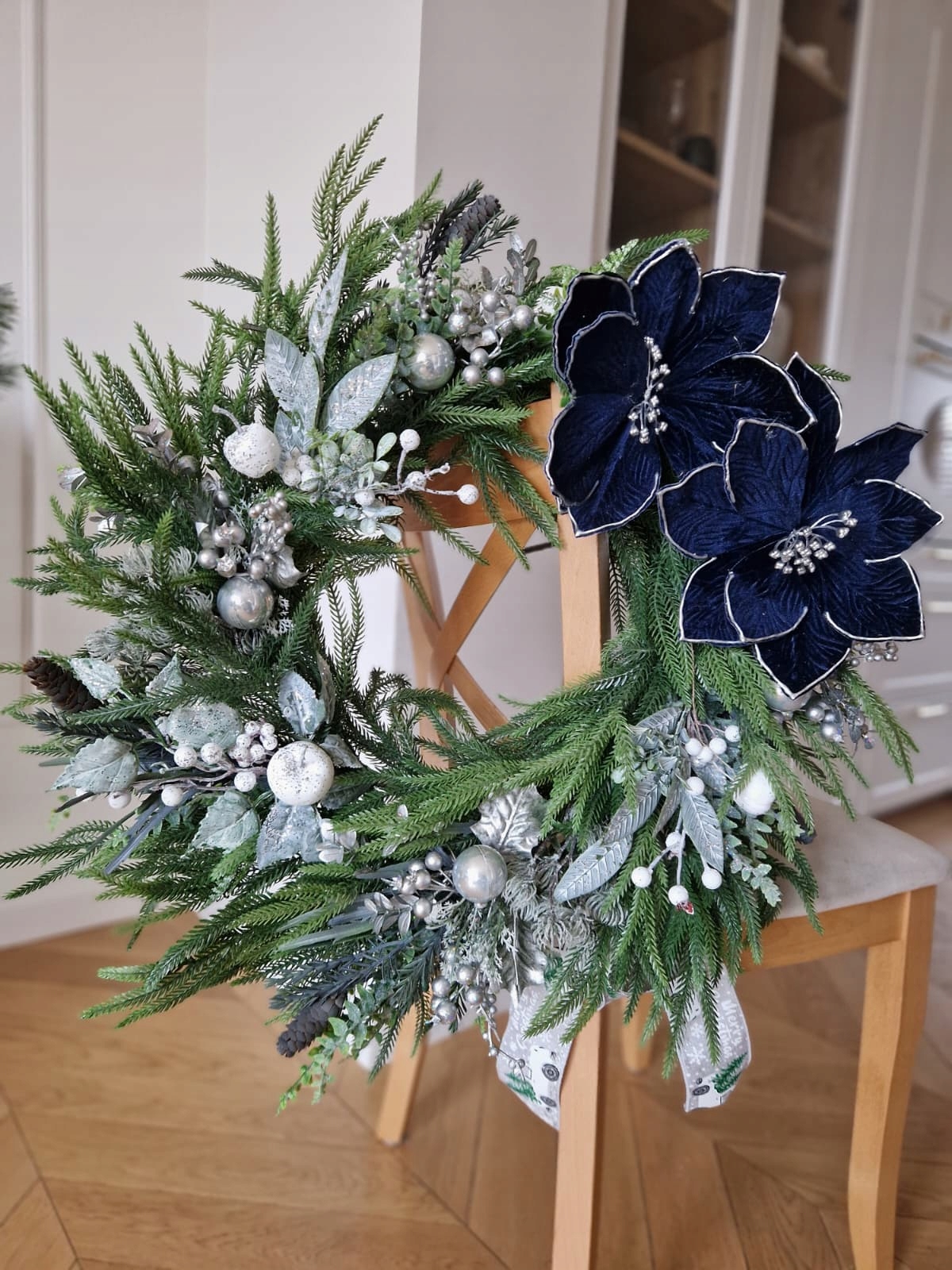 Wieniec zimowy świąteczny bożonarodzeniowy na drzwi Srebro Granat Granatowy