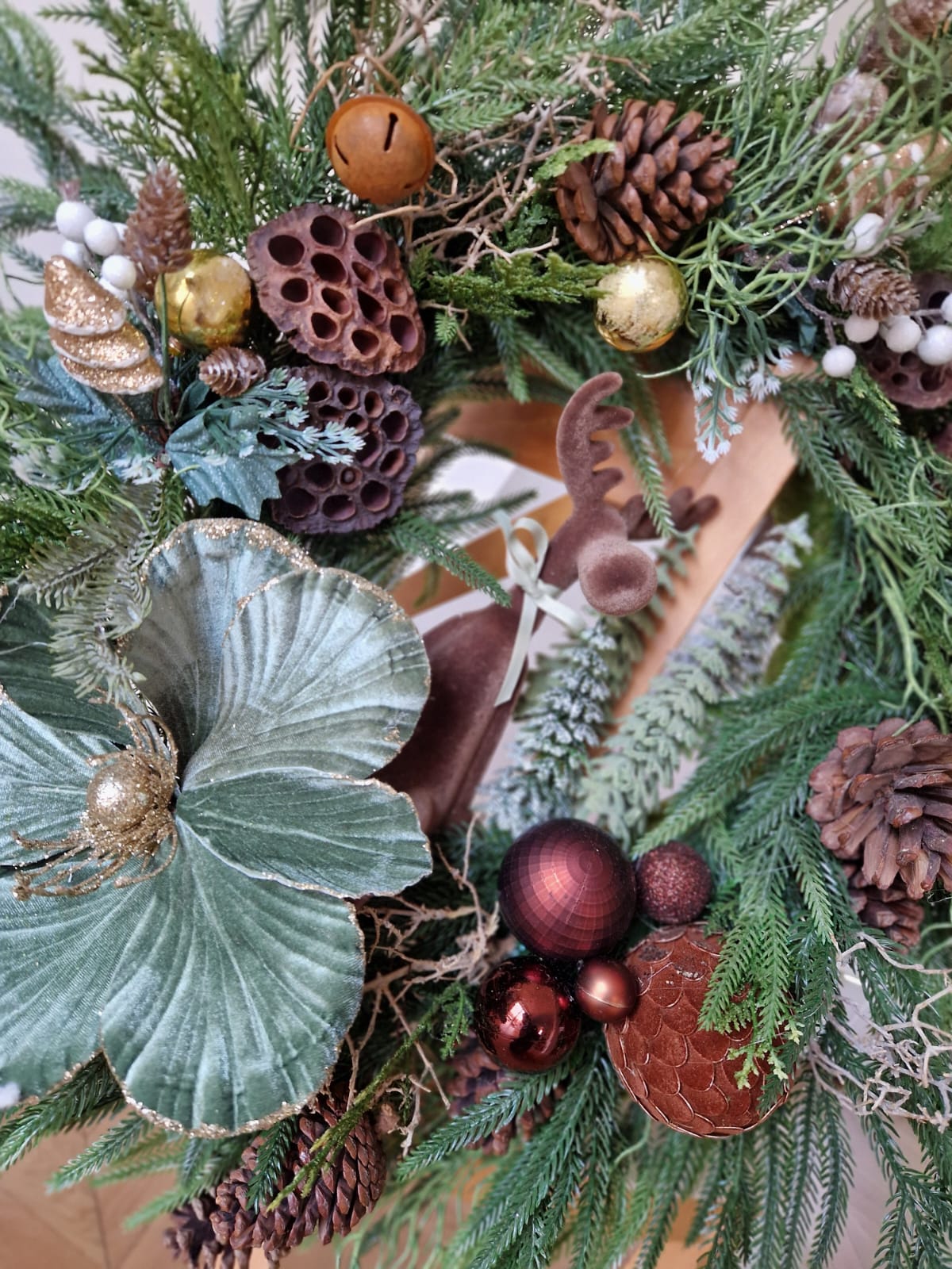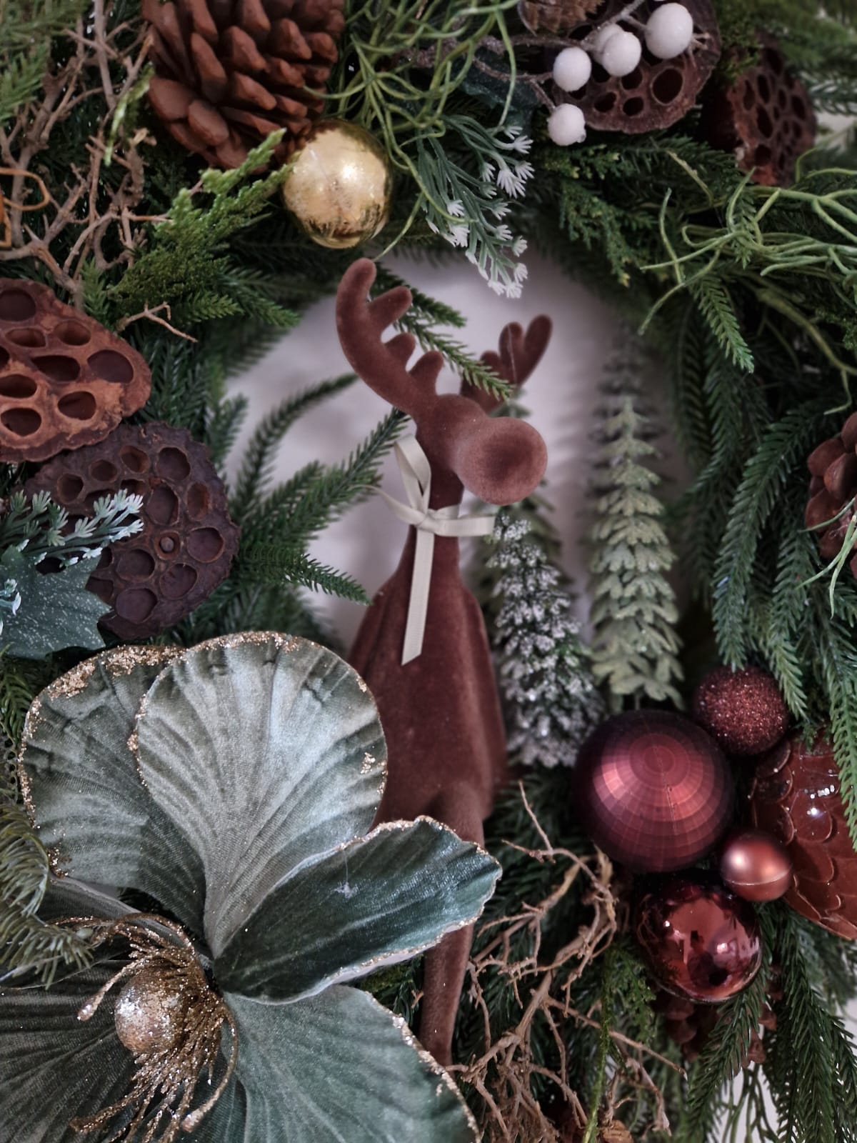 Materiał: słoma, sztuczne zielone gałązki, dekoracyjne gałązki, welurowy kwiat, flokowany renifer, bombki, szyszki i tasiemka.