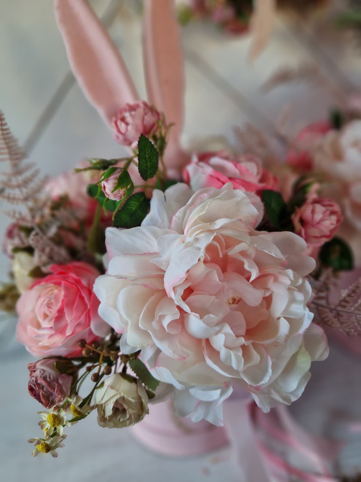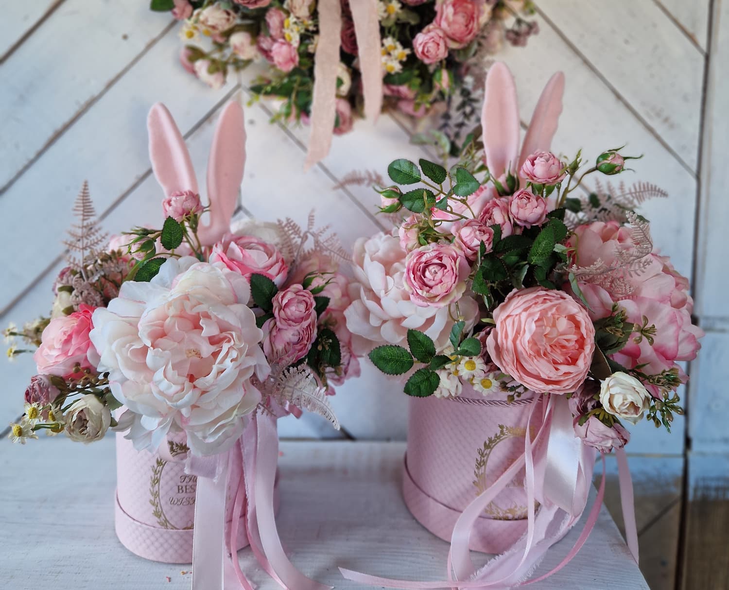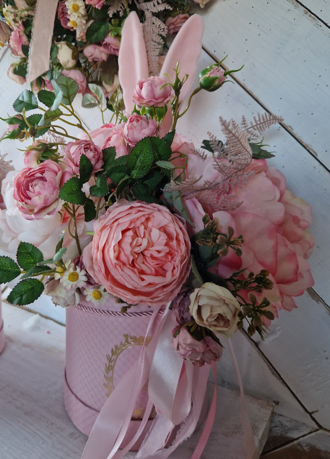 Charakterystycznym elementem dekoracji są urocze, aksamitne uszka zajączka, które nadają całości wielkanocnego charakteru i sprawiają, że kompozycja staje się wyjątkową ozdobą domu lub eleganckim prezentem na święta.