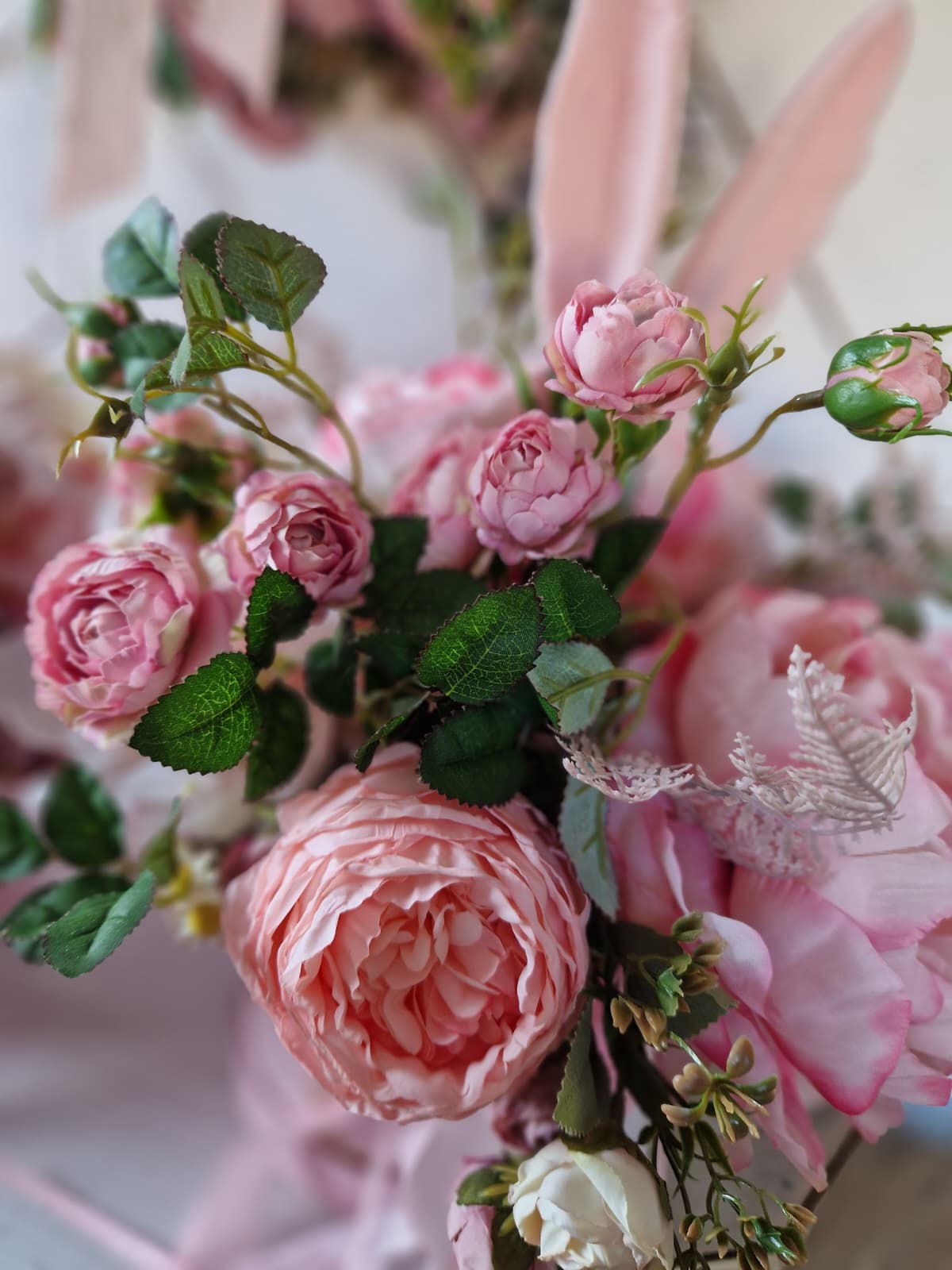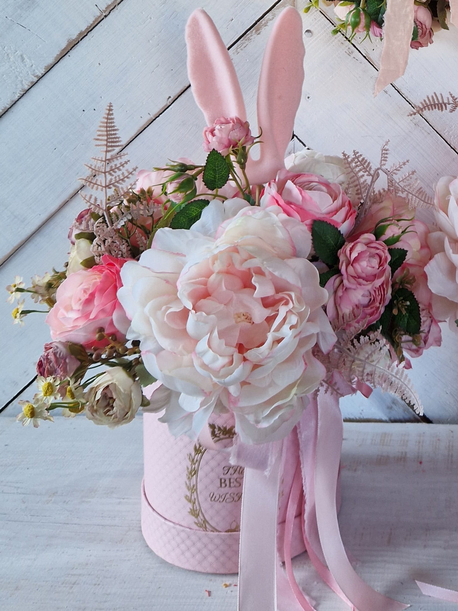 Charakterystycznym elementem dekoracji są urocze, aksamitne uszka zajączka, które nadają całości wielkanocnego charakteru i sprawiają, że kompozycja staje się wyjątkową ozdobą domu lub eleganckim prezentem na święta.