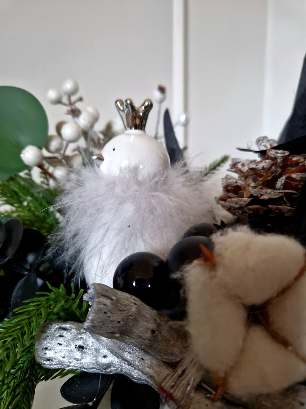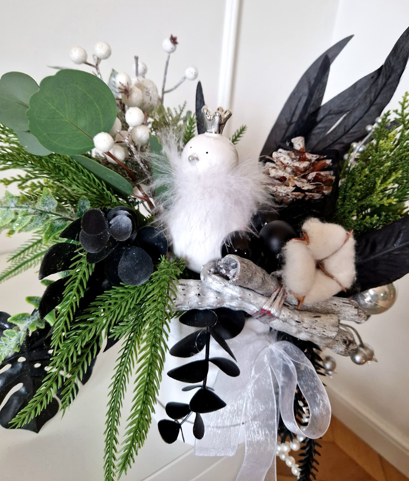 Bogato zdobiony, zimowy, świąteczny stroik, kompozycja kwiatów sztucznych i wyjątkowych dodatków w eleganckiej, czarno - białej i srebrnej kolorystyce w dekoracyjnym białym pudełku. Wysokiej jakości kwiaty sztuczne sprawiają, że kompozycja jest bardzo elegancka i świetnie sprawdzi się jako prezent na specjalne okazje lub ozdoba domu, biura czy recepcji.