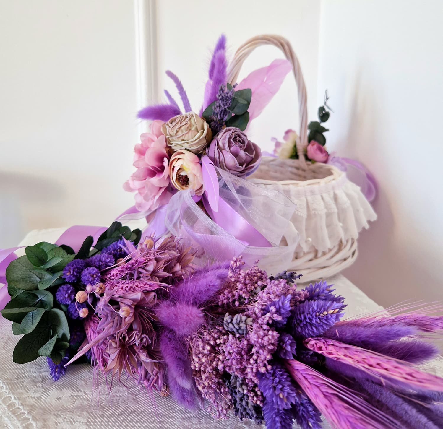 Wyjątkowa palma wielkanocna wykonana ręcznie z wysokiej jakości suszonych i stabilizowanych roślin. Kompozycja utrzymana w eleganckiej kolorystyce fioletu i lawendy, z dodatkiem naturalnej zieleni eukaliptusa. Całość dopełnia satynowa wstążka w kolorze liliowym, nadająca palmie lekkości i świątecznego charakteru.