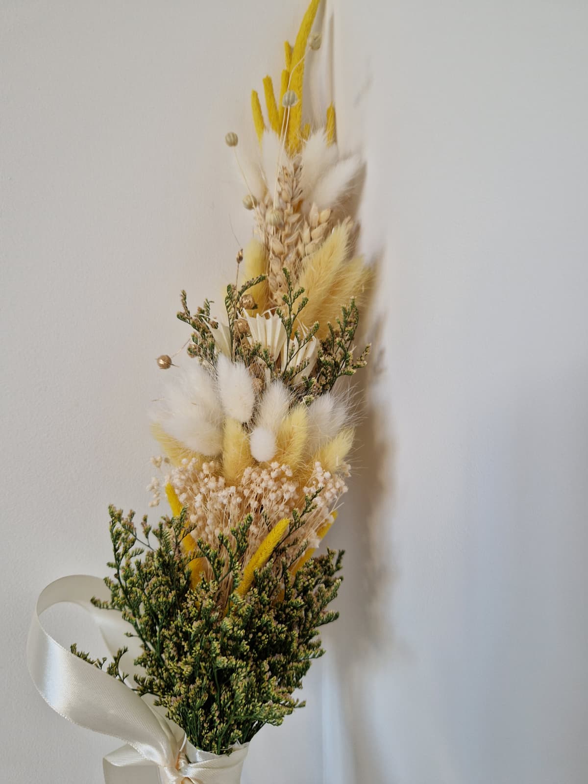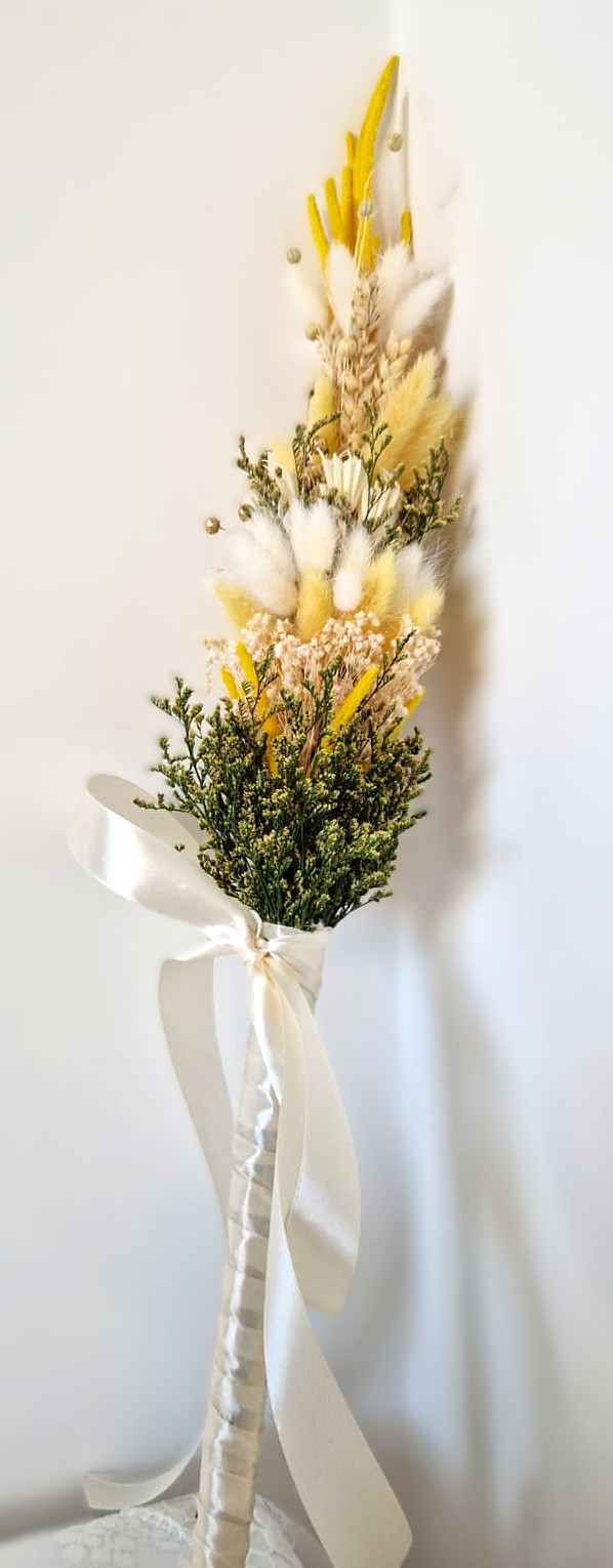 Wyjątkowa palma wielkanocna wykonana ręcznie z wysokiej jakości suszonych i stabilizowanych roślin. Kompozycja utrzymana w eleganckiej kolorystyce pastelowego zółtego i wanilii. Całość dopełnia satynowa wstążka w kolorze kremowym, nadająca palmie lekkości i świątecznego charakteru.