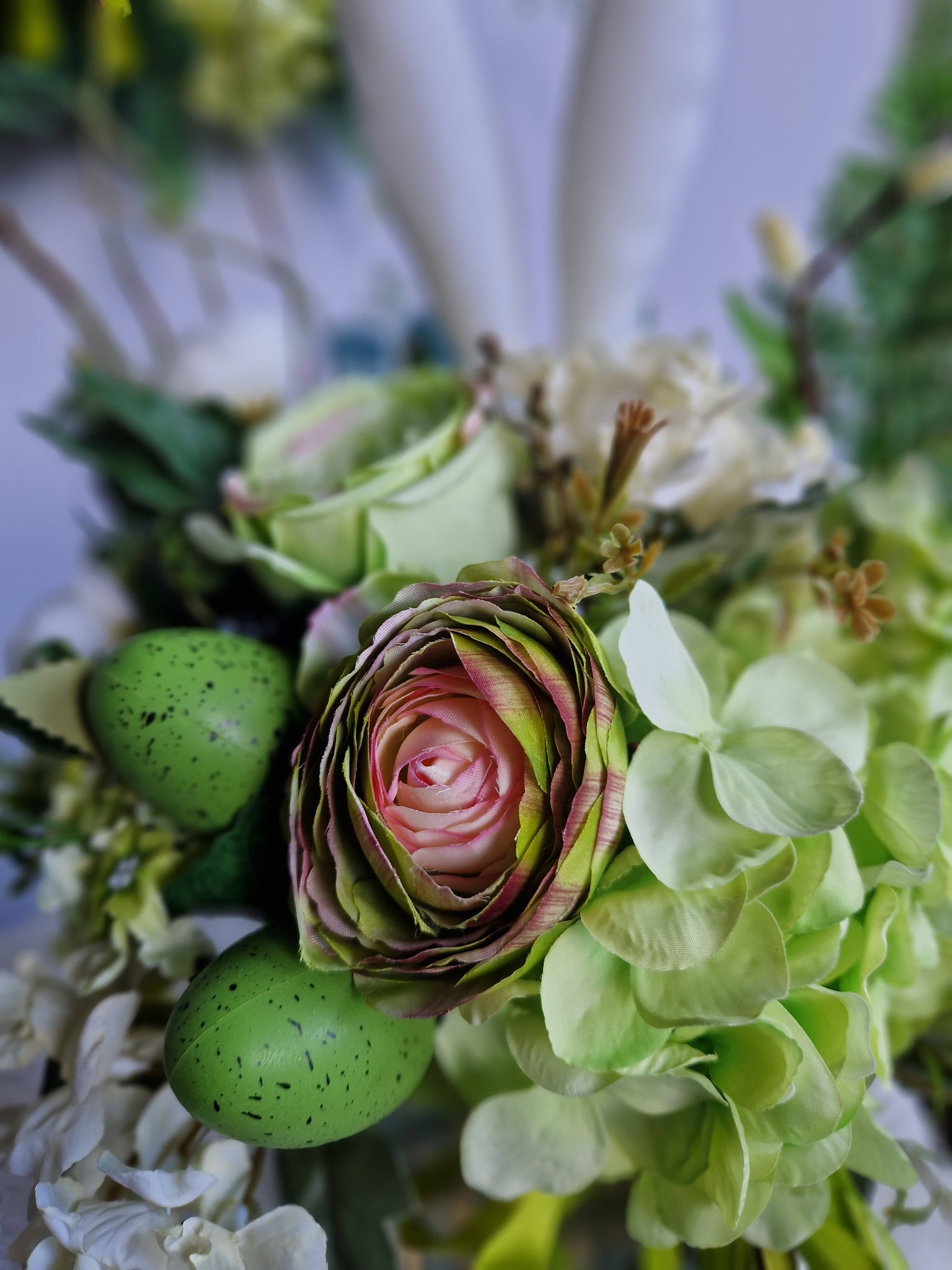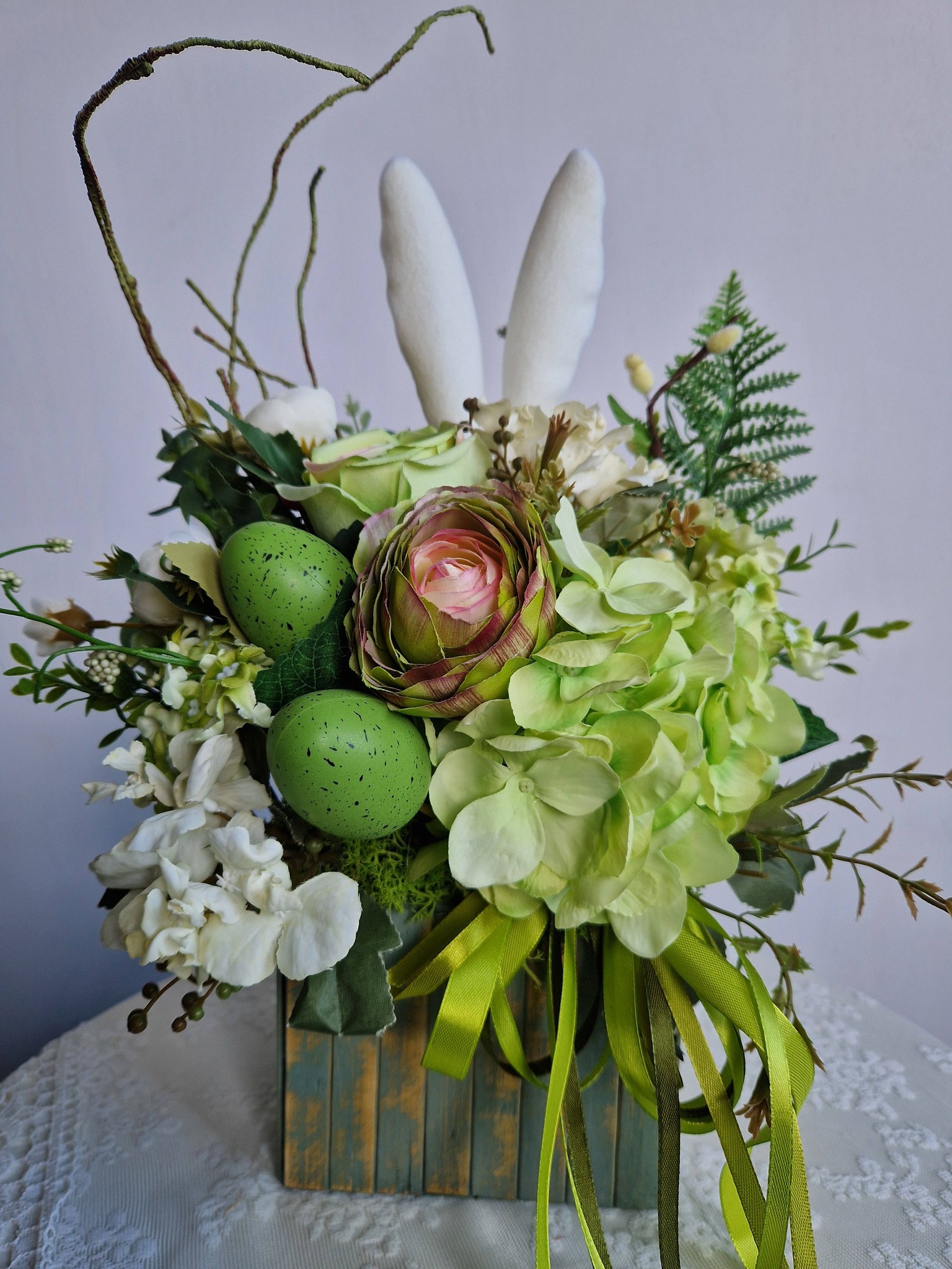 Miękkie zajączkowe uszy, pastelowe jajka i bogata kompozycja kwiatów tworzą dekorację, która wprowadza do wnętrza spokój, radość i prawdziwie świąteczny klimat 🐰💚
