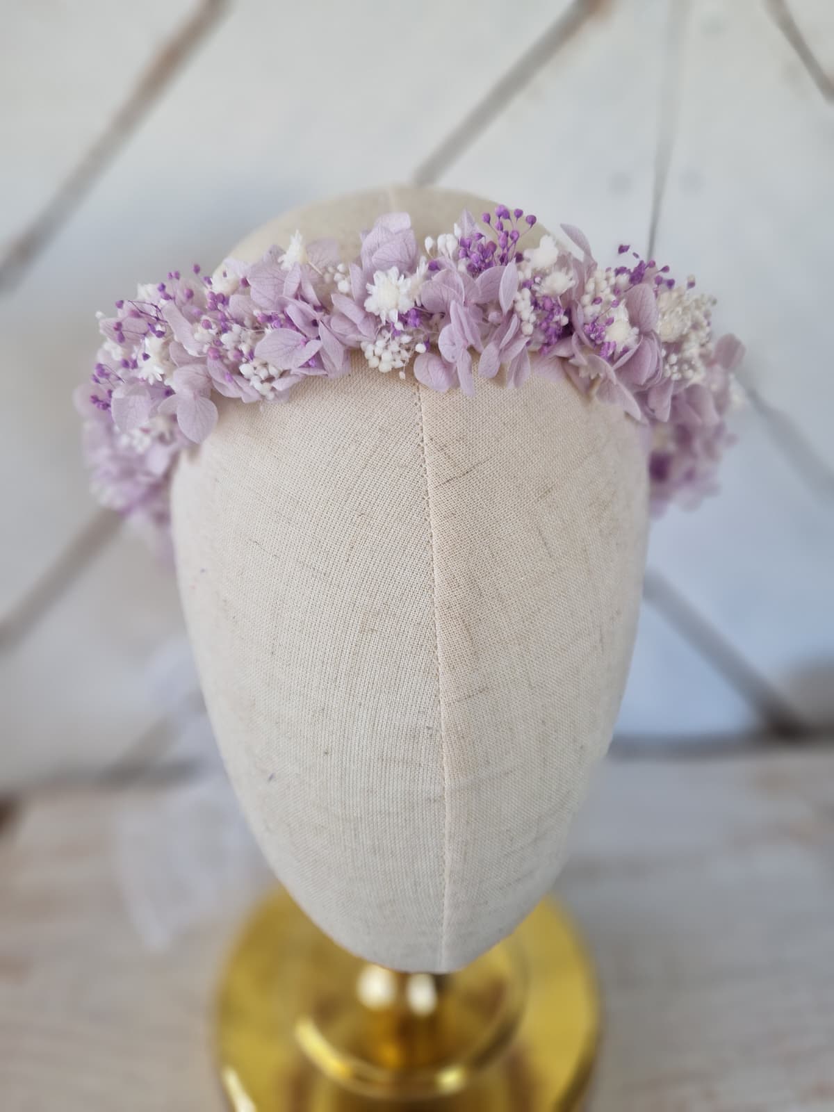 Delikatny, romantyczny i wyjątkowo subtelny wianek komunijny wykonany ręcznie z naturalnych stabilizowanych kwiatów. W kompozycji znalazła się liliowa hortensja, drobna biała i lawendowa gipsówka oraz suszona glixia, które tworzą lekką, dziewczęcą i bardzo elegancką całość.