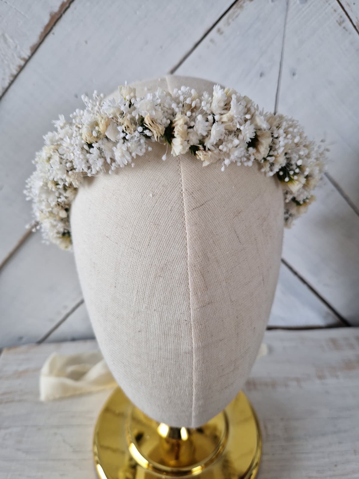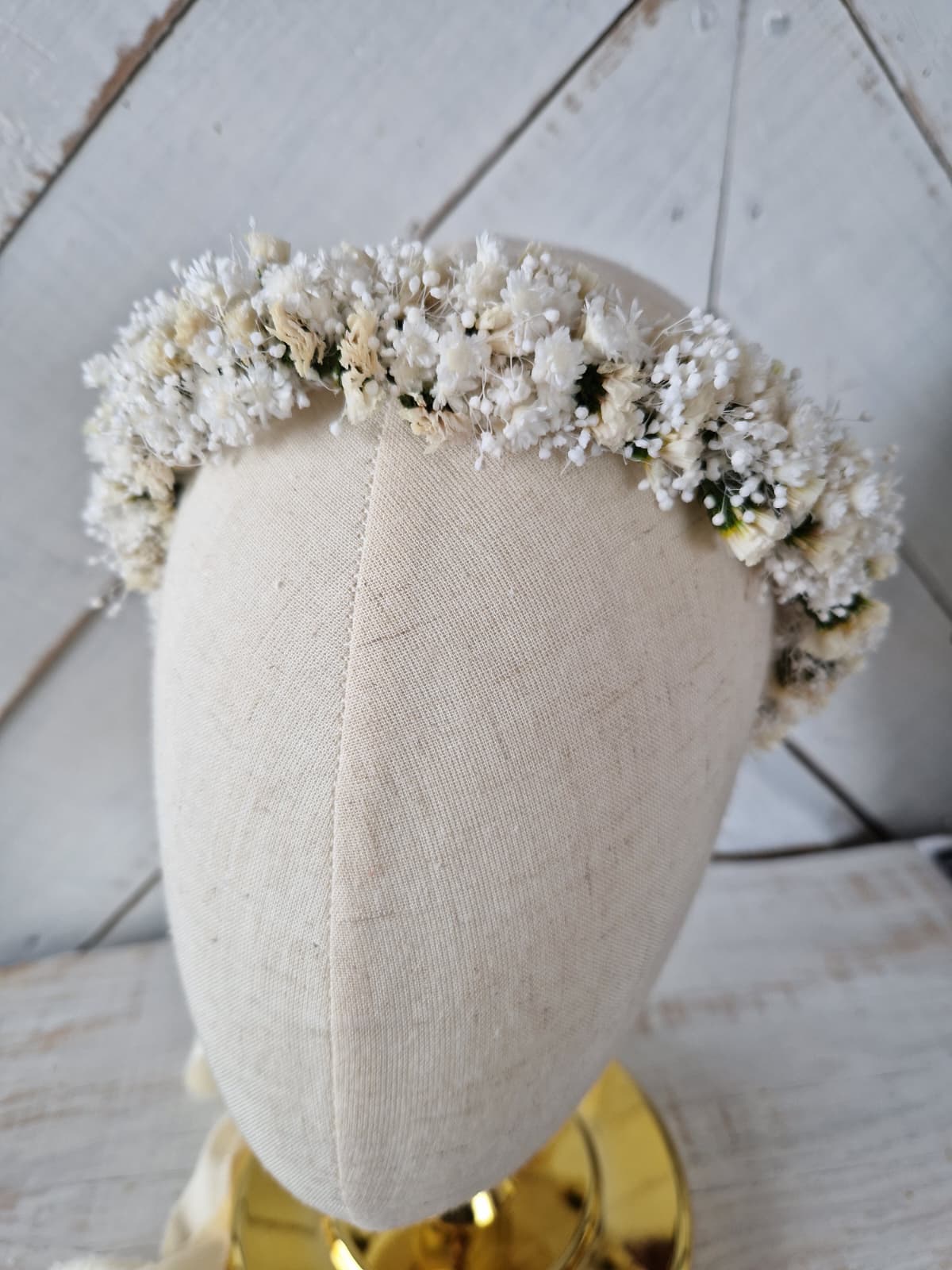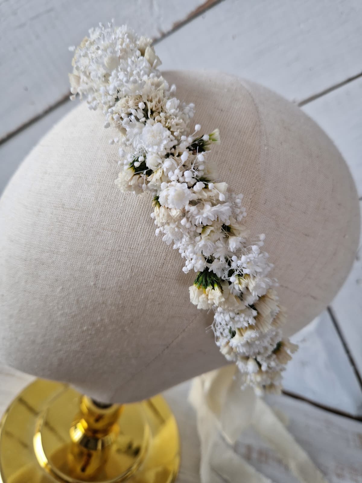 Romantyczny, kwiatowy, delikatny wianek na głowę wykonany ze stabilizowanych kwiatów drobnej gipsówki, glixii i statycji. Z tyłu wianek posiada wstążkę, dzięki której istnieje możliwość regulacji wielkości. Kwiatowy wianek w stylu rustykalnym, boho, to doskonała propozycja na komunię świętą, dodatek do stylizacji Panny młodej lub druhny podczas ślubu, wieczoru panieńskiego, sesji zdjęciowej i innych imprez okolicznościowych.