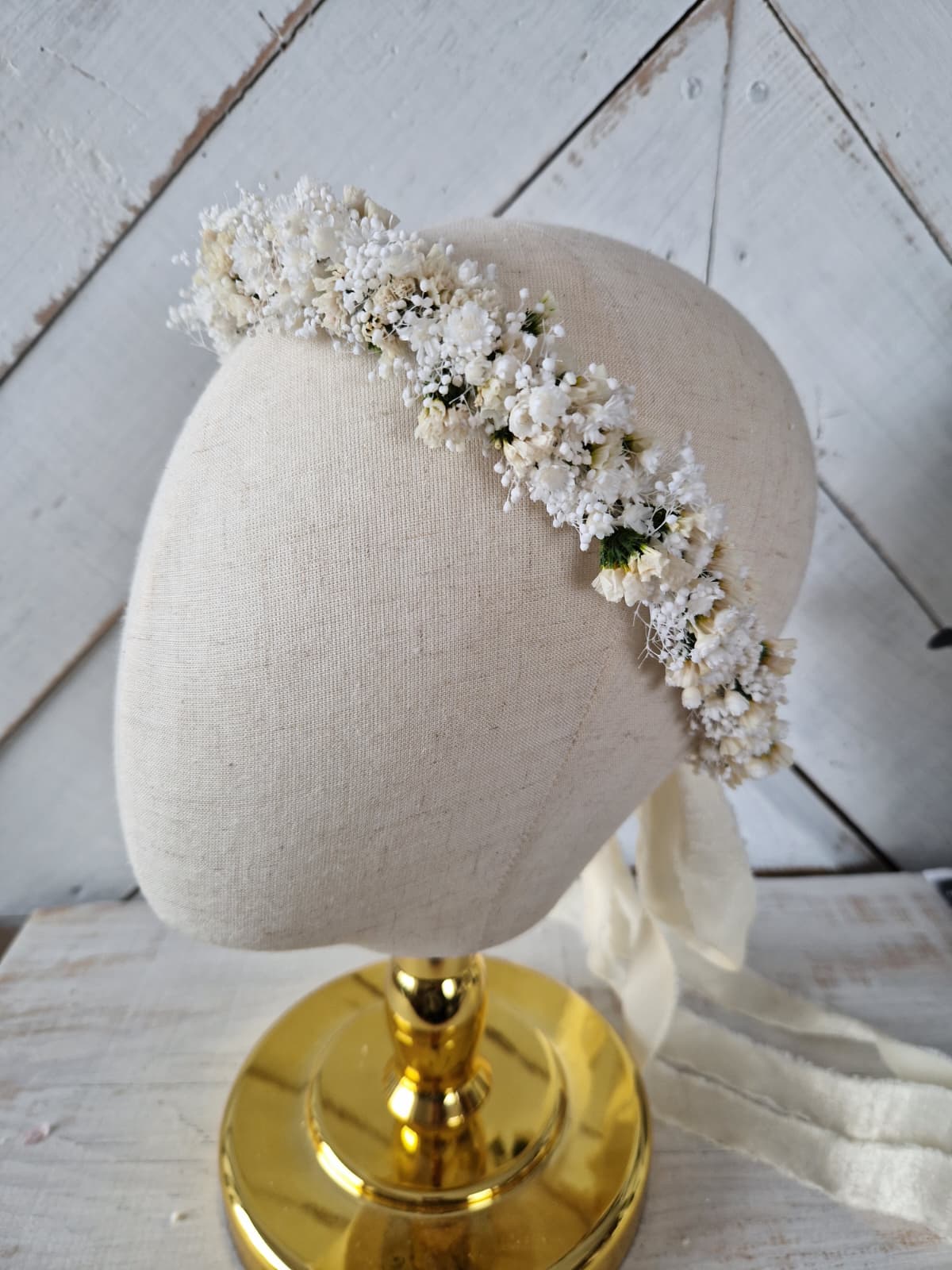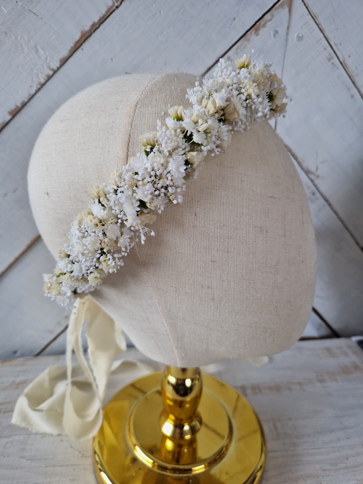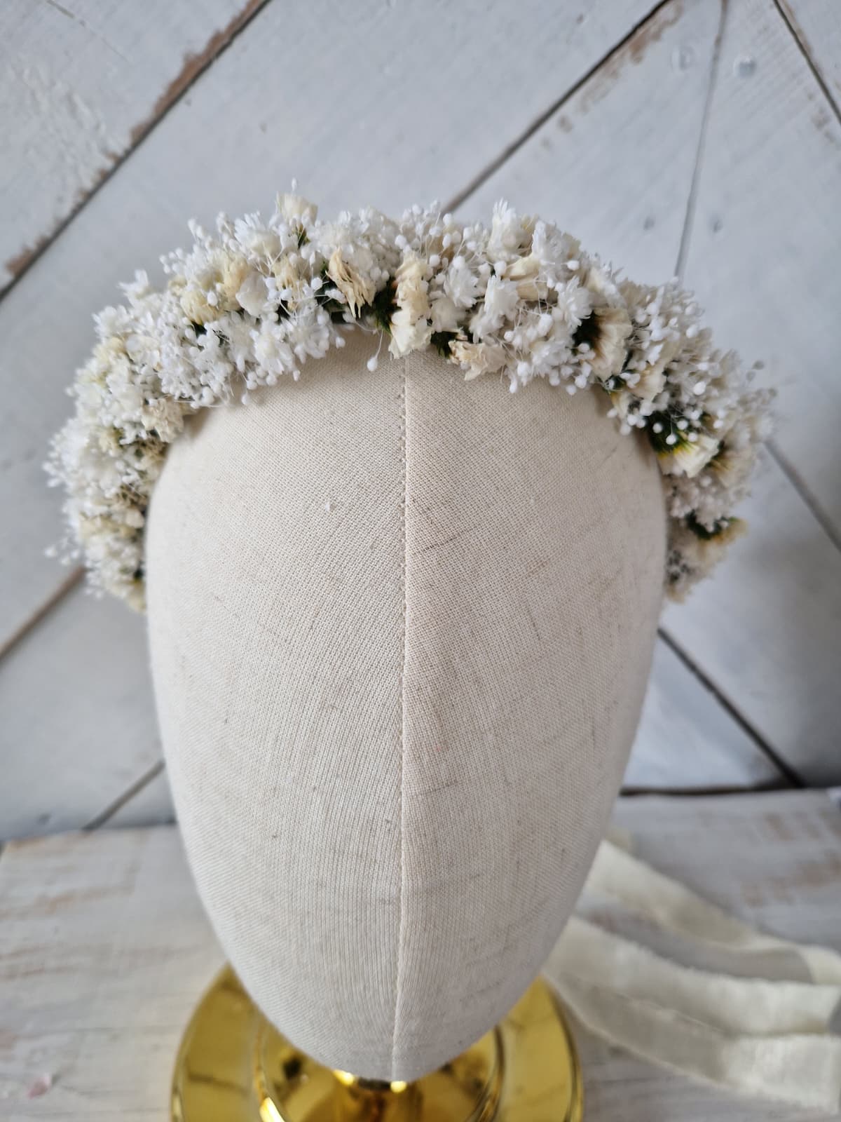 Romantyczny, kwiatowy, delikatny wianek na głowę wykonany ze stabilizowanych kwiatów drobnej gipsówki, glixii i statycji. Z tyłu wianek posiada wstążkę, dzięki której istnieje możliwość regulacji wielkości. Kwiatowy wianek w stylu rustykalnym, boho, to doskonała propozycja na komunię świętą, dodatek do stylizacji Panny młodej lub druhny podczas ślubu, wieczoru panieńskiego, sesji zdjęciowej i innych imprez okolicznościowych.