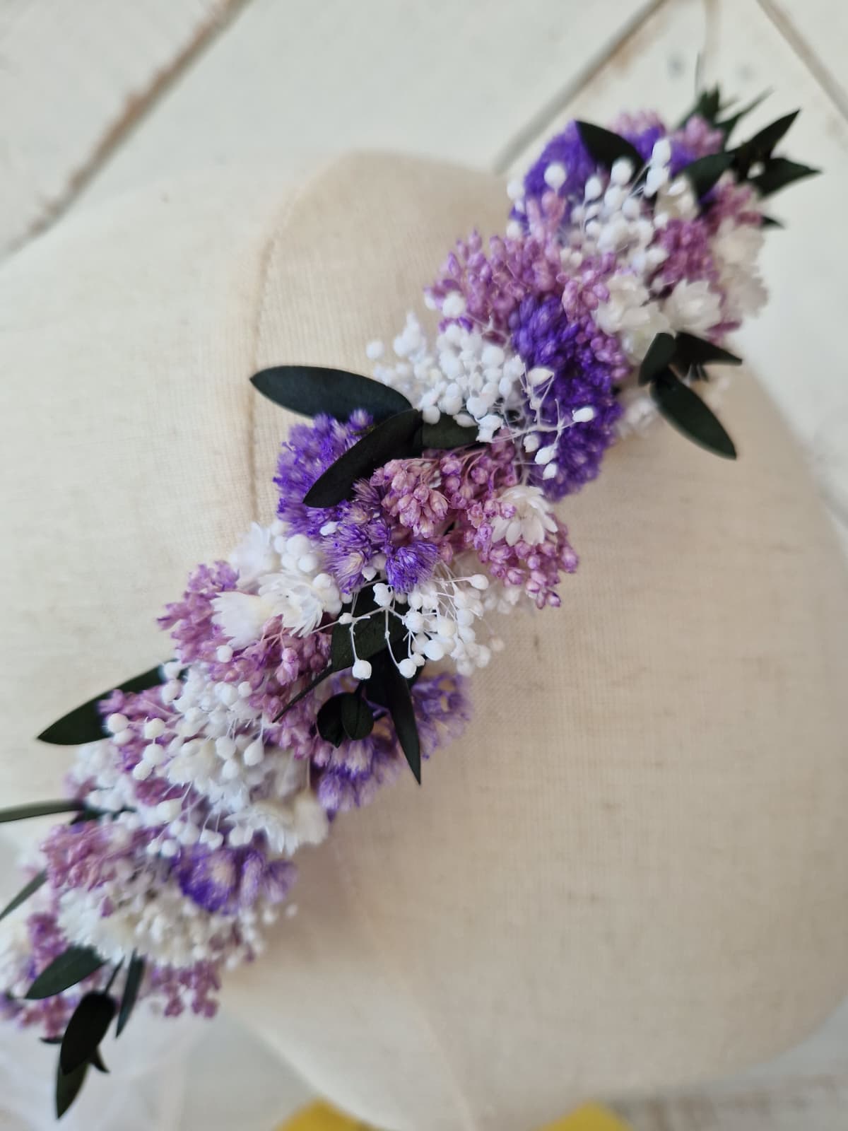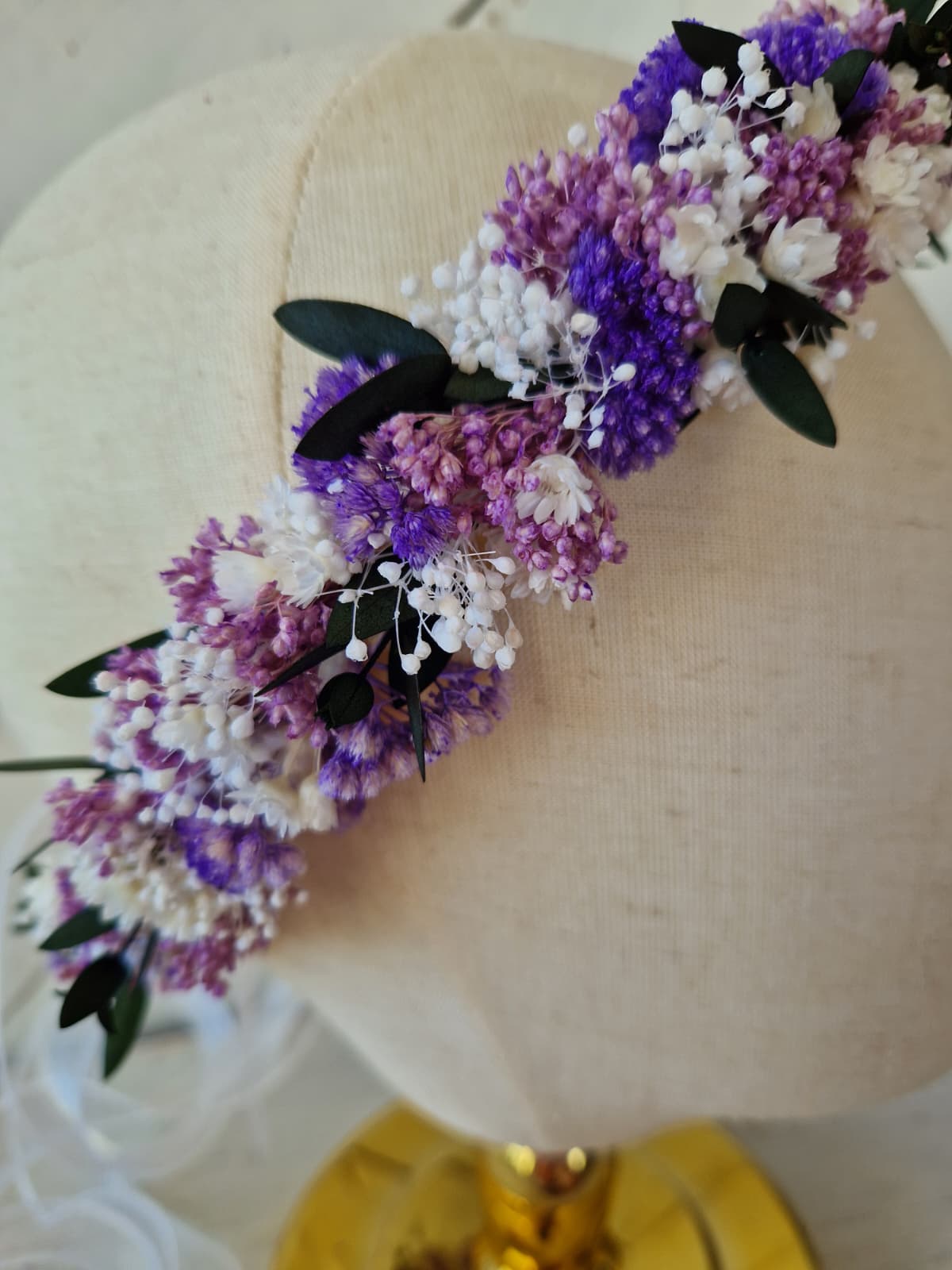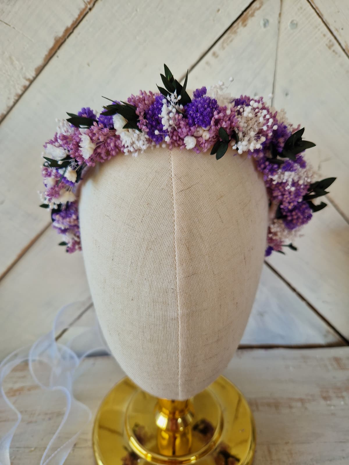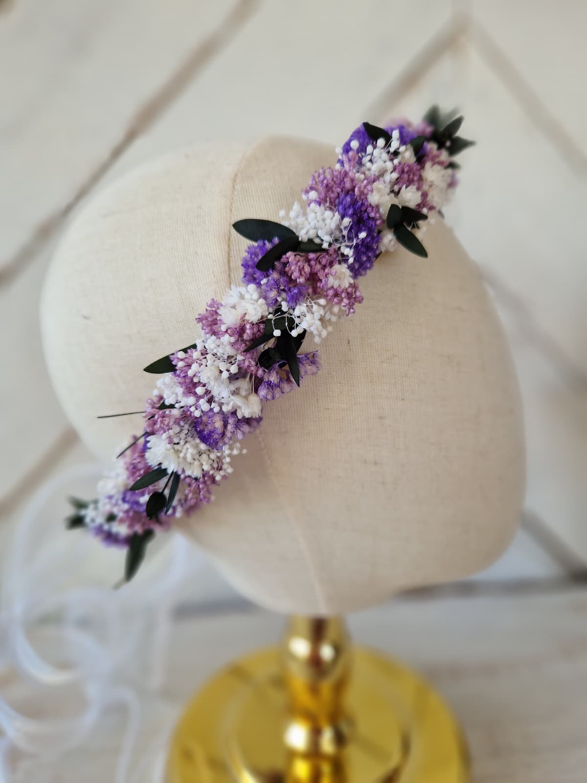 Delikatny wianek komunijny wykonany ze stabilizowanych kwiatów w kolorze bieli i lawendy, z dodatkiem zieleni.