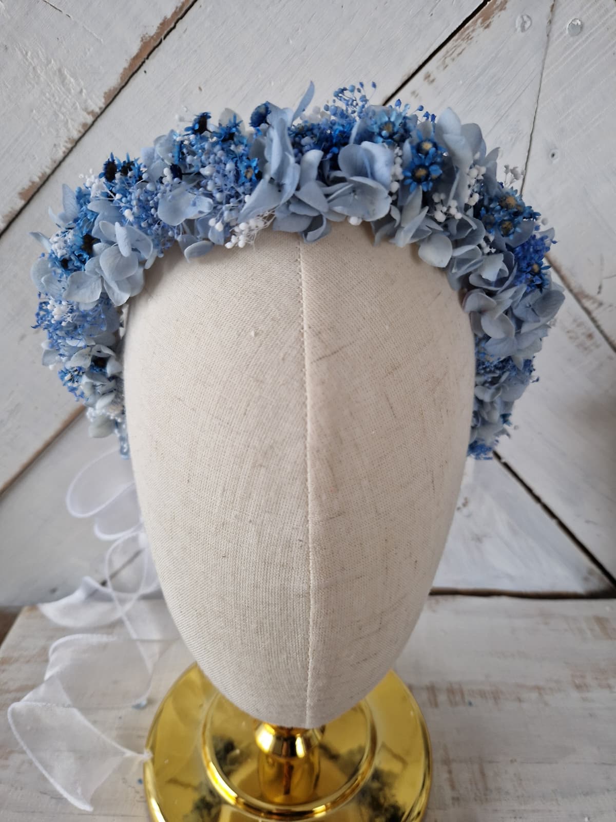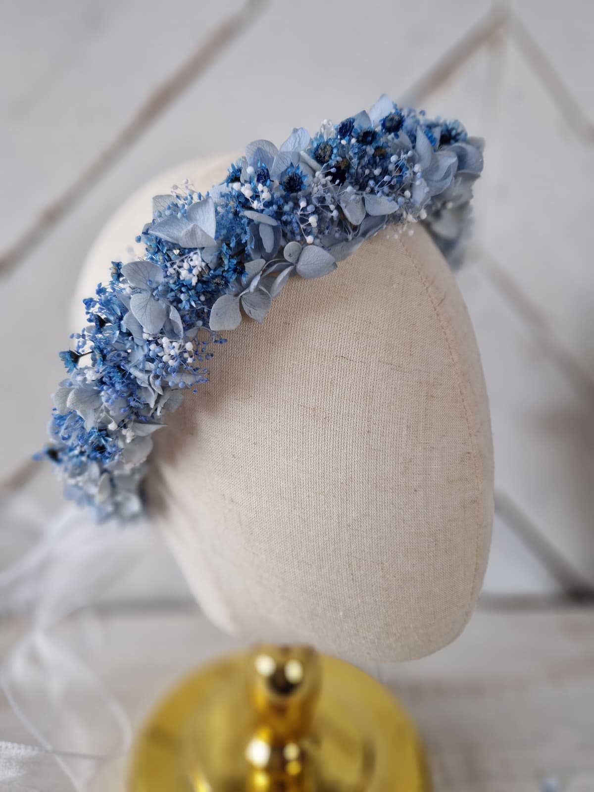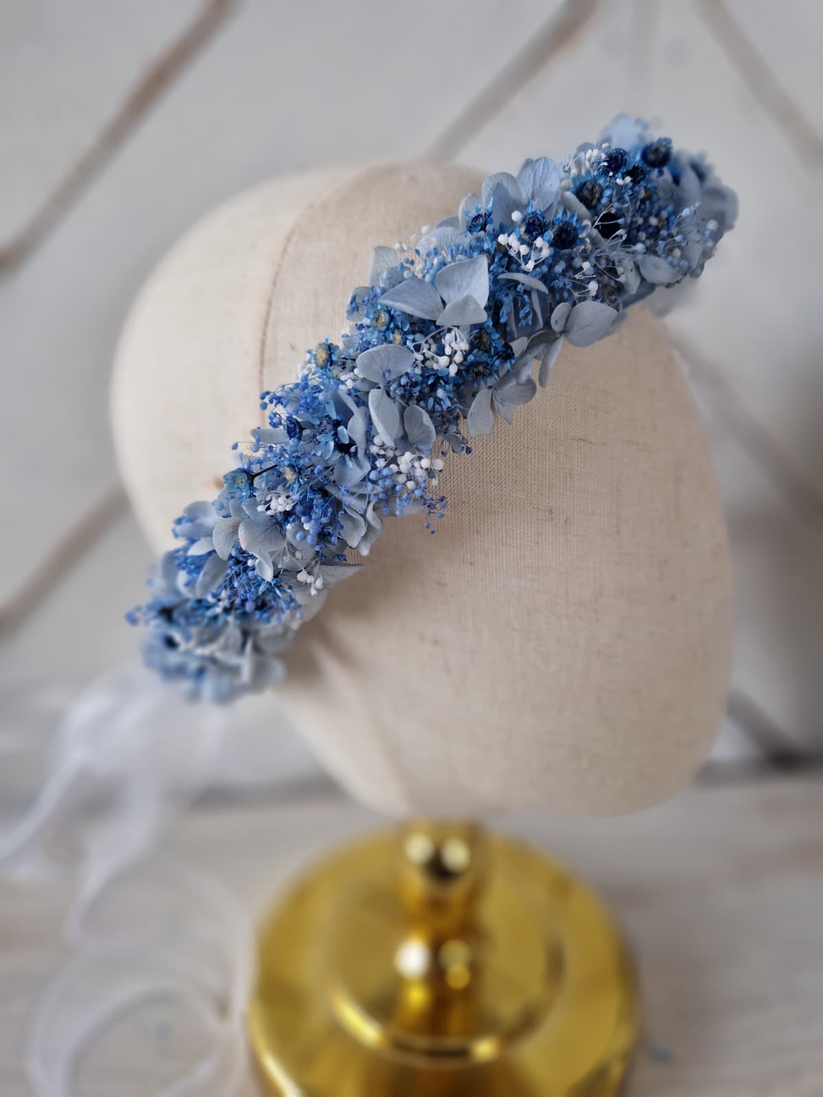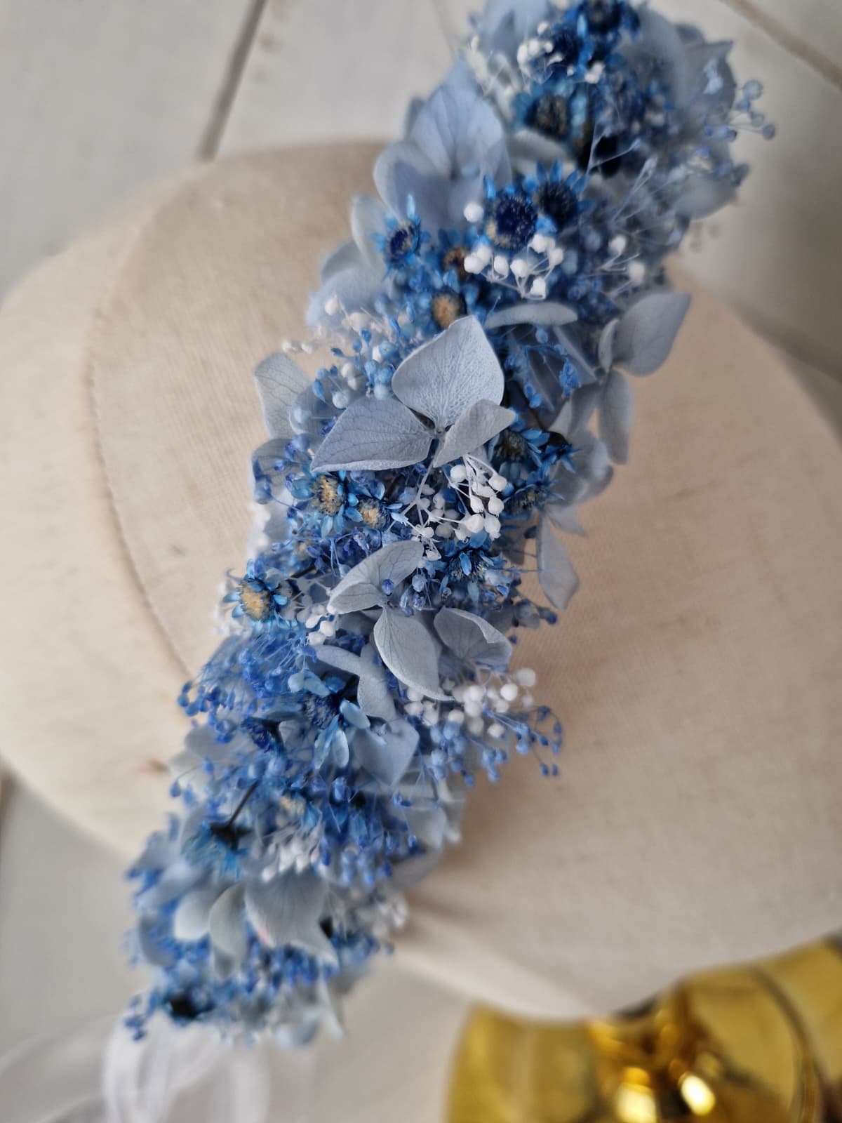 Romantyczny, kwiatowy wianek na głowę w odcieniach koloru białego i niebieskiego, wykonany ze stabilizowanej drobnej gipsówki, hortensji i glixii. Z tyłu wianek posiada szyfonową tasiemkę, dzięki której istnieje możliwość regulacji wielkości. Kwiatowy wianek w stylu rustykalnym, boho, to doskonała propozycja na komunię świętą, dodatek do stylizacji Panny młodej lub druhny podczas ślubu, wieczoru panieńskiego, sesji zdjęciowej i innych imprez okolicznościowych.