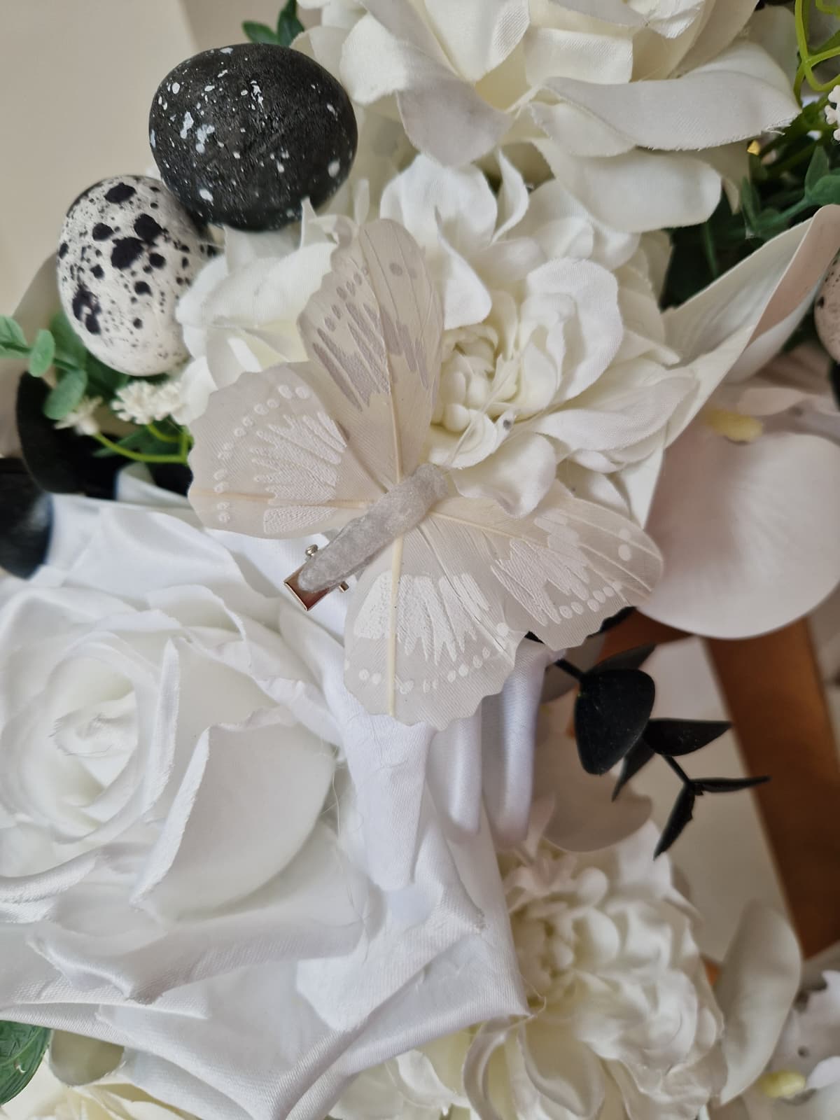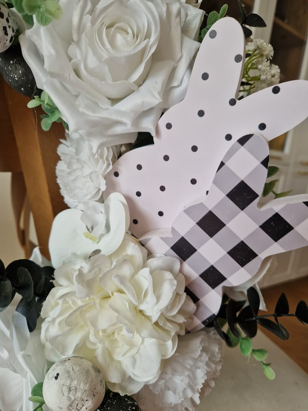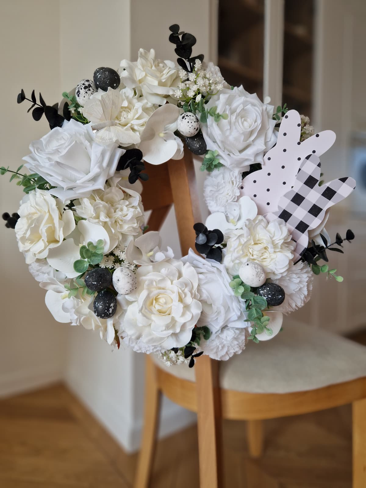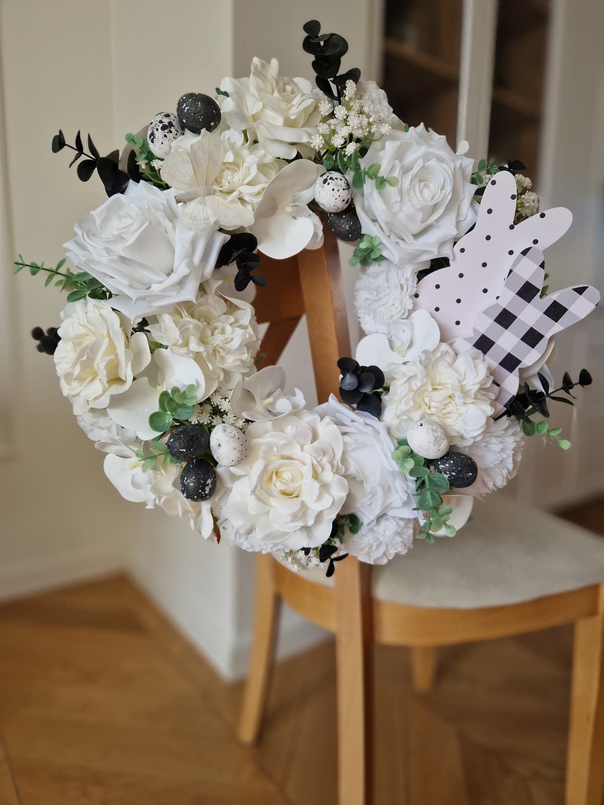 Wianek wiosenny na wiklinowym ringu, kwiatowy, wielkanocny, wykonany ręcznie ze sztucznych kwiatów i dodatków wysokiej jakości. Wianek wykonany został w kolorystyce białej z elementami czarnego.