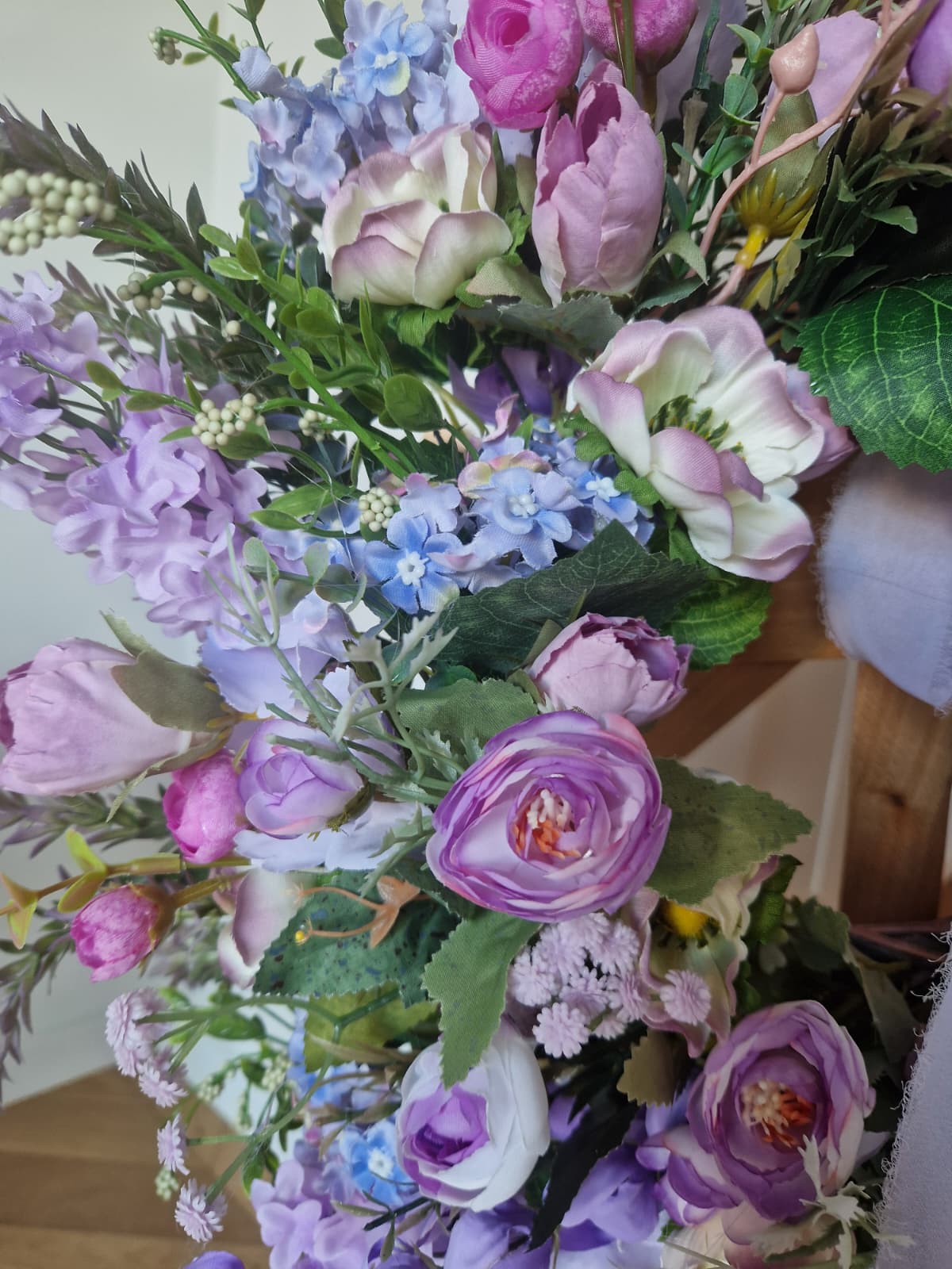 Delikatny, romantyczny i pełen subtelnego uroku – „Lawendowa Symfonia” to kompozycja inspirowana spokojem letnich ogrodów o poranku. Wianek został stworzony z bogactwa kwiatów w odcieniach lawendy, pudrowego różu i pastelowego błękitu. Znajdziesz w nim pełne jaskry azjatyckie, drobne kwiaty hortensji i bzu, subtelne pąki róż, lekkie gałązki niezapominajek oraz delikatną, naturalnie wyglądającą zieleń.