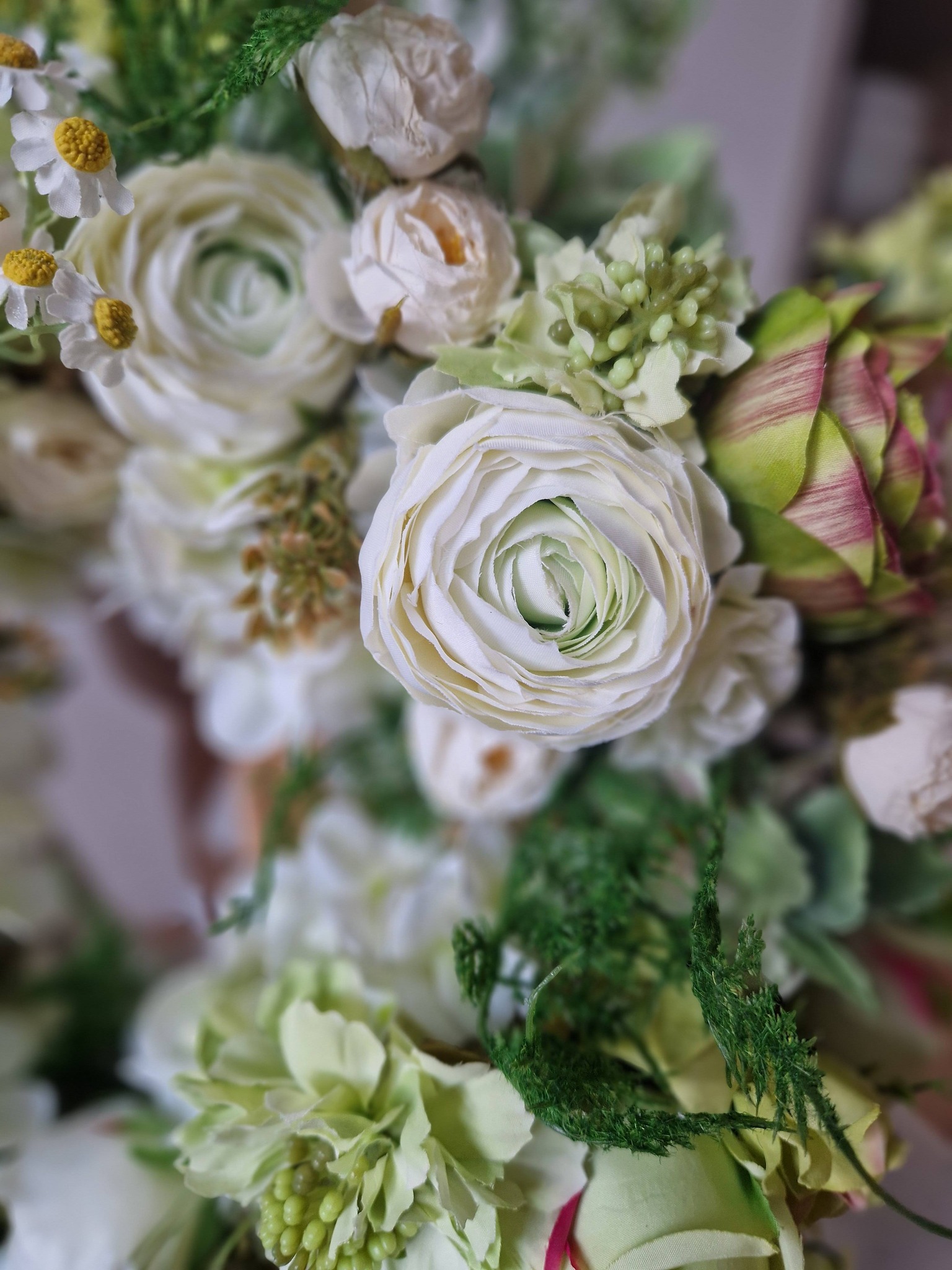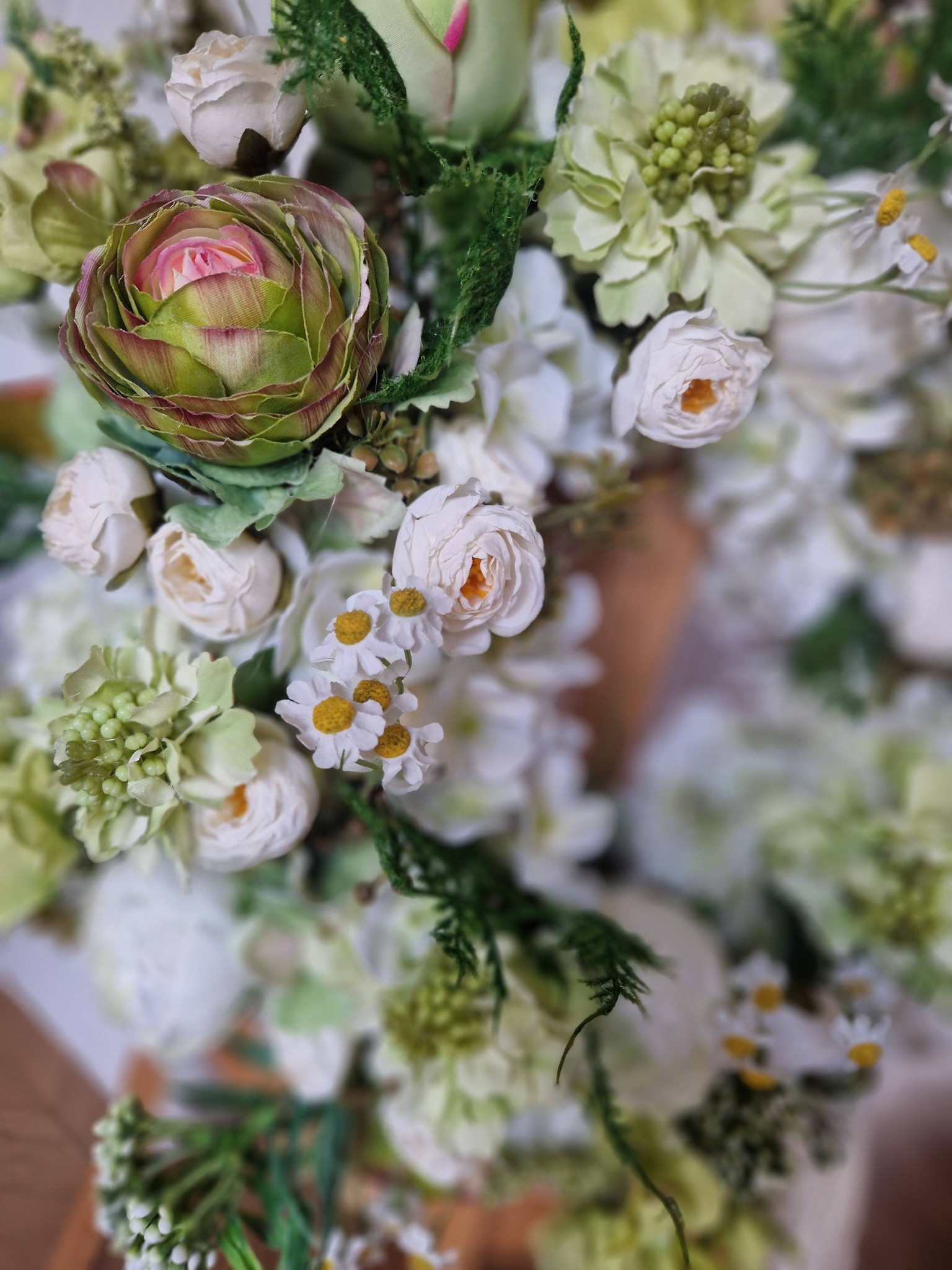 Lekki, pełen świeżości wianek w odcieniach bieli i subtelnej zieleni. Delikatne róże, jaskry, drobne stokrotki i wiosenne dodatki tworzą naturalną, romantyczną kompozycję, która wnosi do wnętrza powiew wiosny.