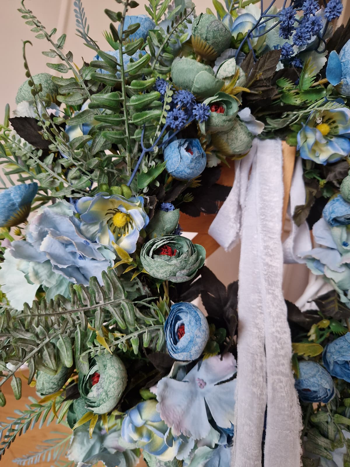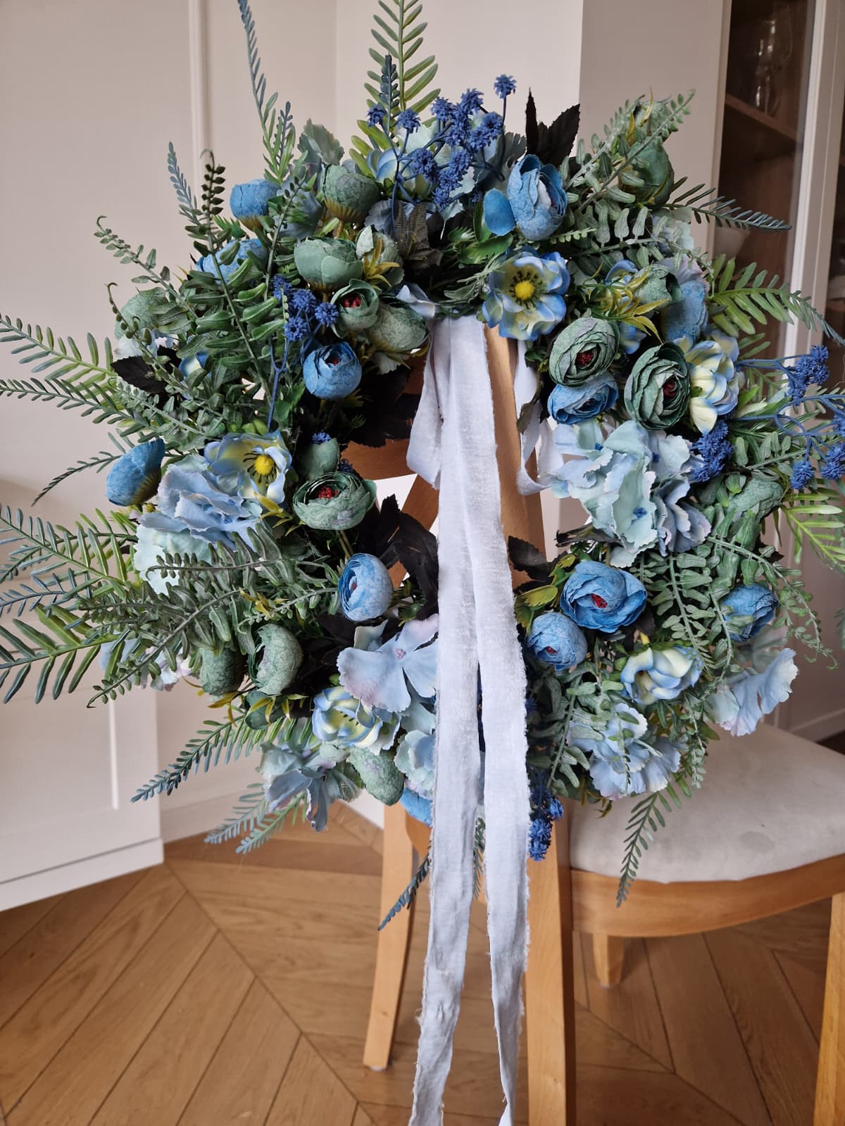 „Mięta i Błękit” to wyjątkowy wianek, który łączy subtelne kwiaty w tonacjach błękitu, szałwii i delikatnej mięty z lekką, szyfonową wstążką