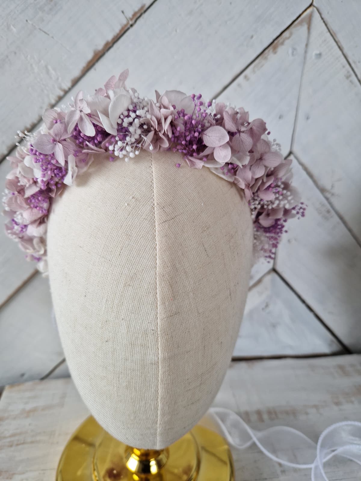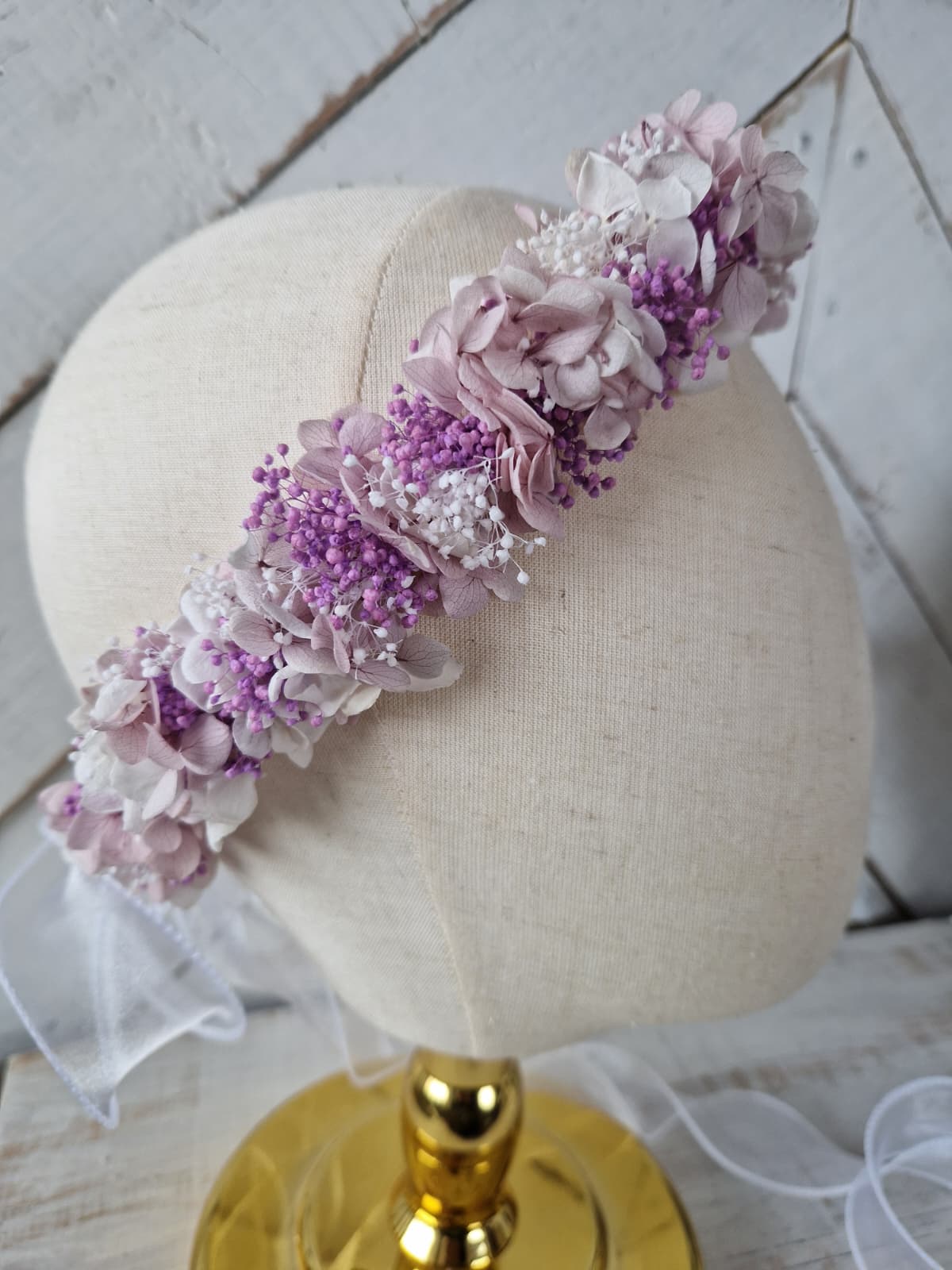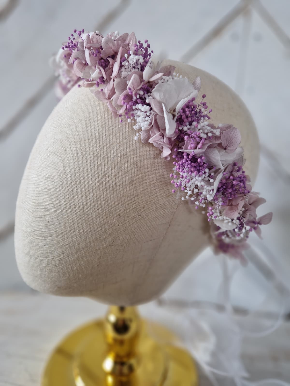 Romantyczny, kwiatowy wianek na głowę wykonany ze stabilizowanych kwiatów hortensji i drobnej gipsówki w kolorze białym i lawendowym. Z tyłu wianek posiada szyfonową wstążkę, dzięki której istnieje możliwość regulacji wielkości. Kwiatowy wianek w stylu rustykalnym, boho, to doskonała propozycja na komunię świętą, dodatek do stylizacji Panny młodej lub druhny podczas ślubu, wieczoru panieńskiego, sesji zdjęciowej i innych imprez okolicznościowych.