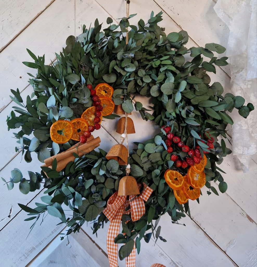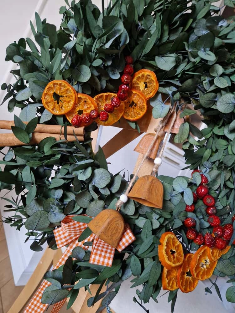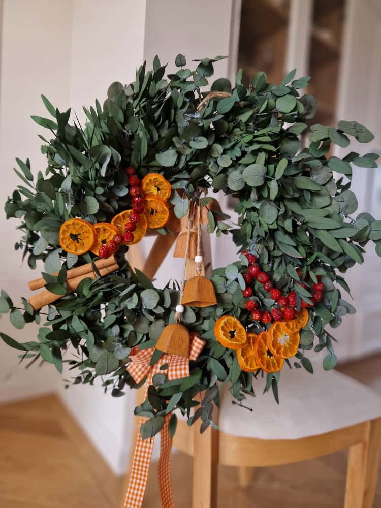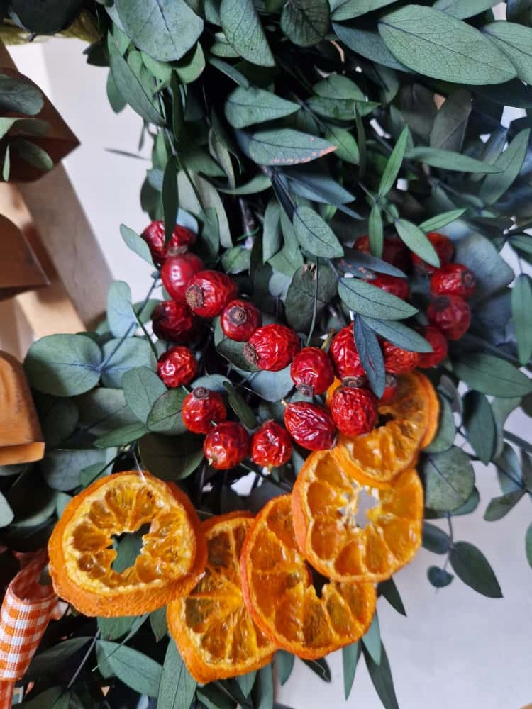 Ten wianek to kwintesencja naturalnego uroku i świątecznego ciepła. Ręcznie wykonany ze stabilizowanego eukaliptusa, udekorowany suszoną mandarynką, owocami dzikiej róży i laskami cynamonu - wprowadzi do wnętrza przytulny, zimowy klimat.