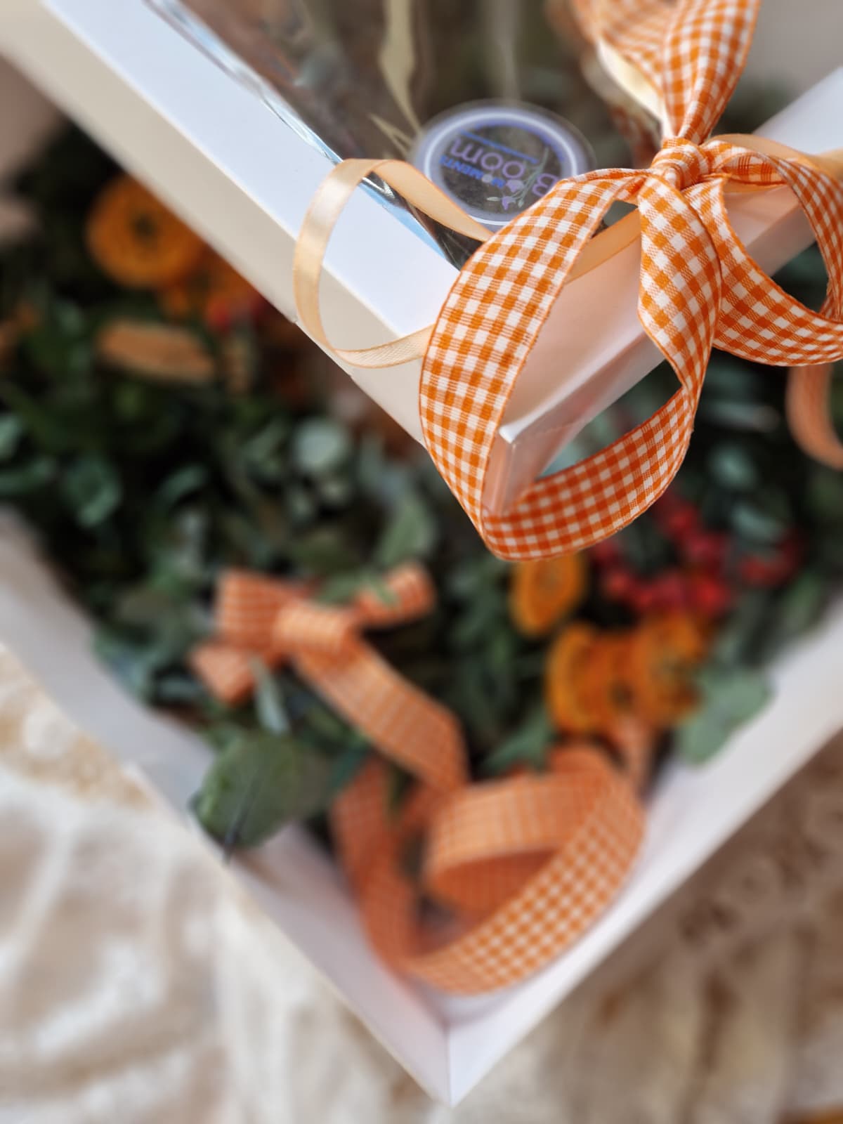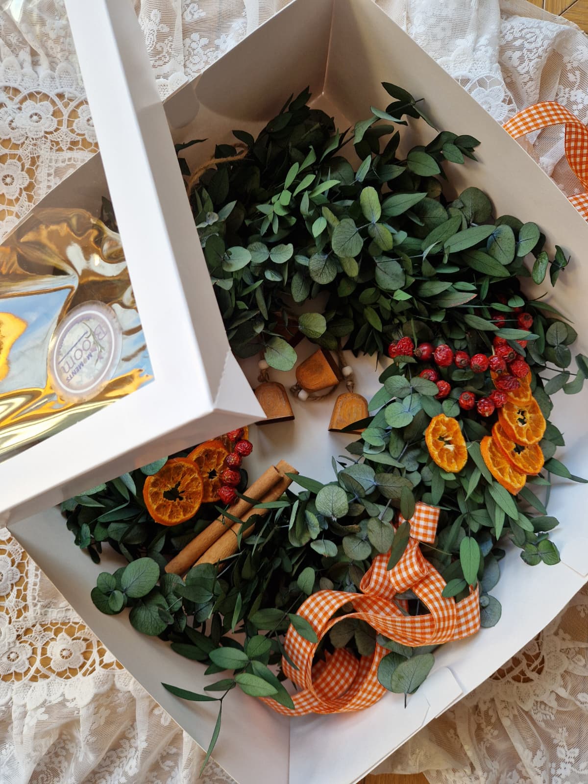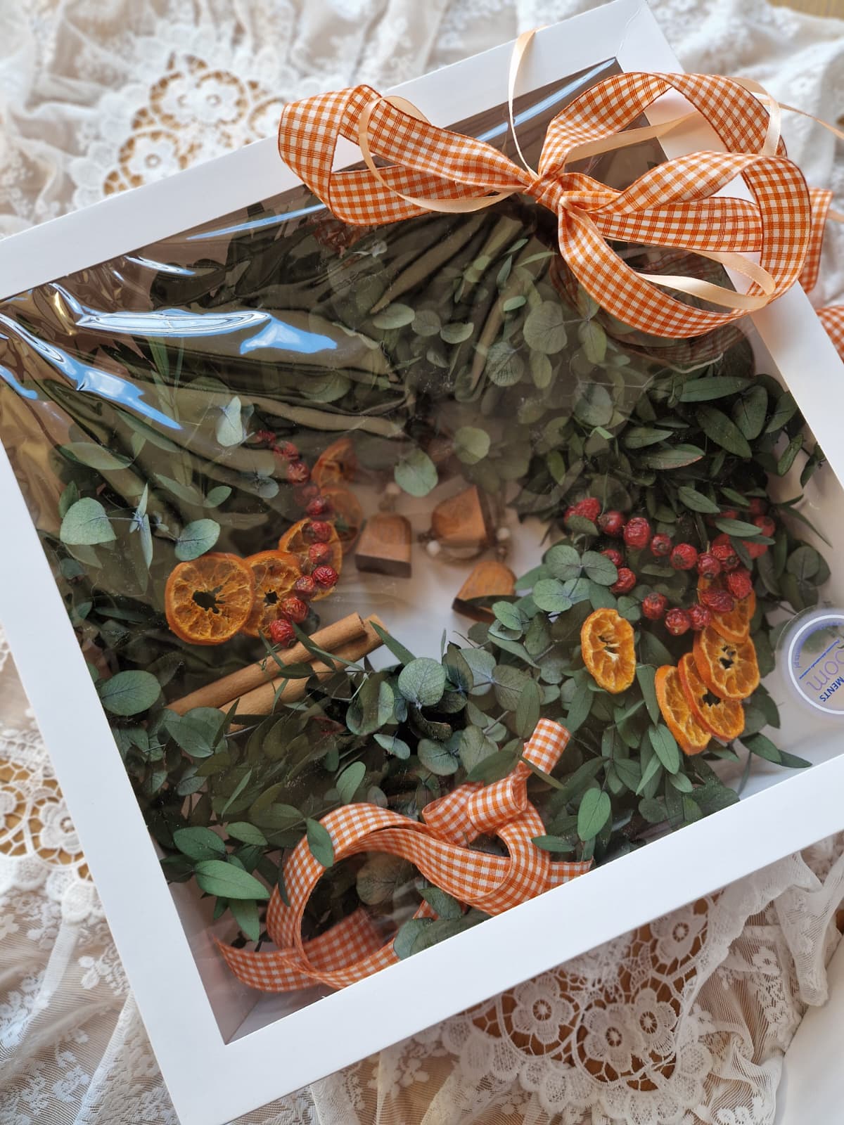 Ten wianek to kwintesencja naturalnego uroku i świątecznego ciepła. Ręcznie wykonany ze stabilizowanego eukaliptusa, udekorowany suszoną mandarynką, owocami dzikiej róży i laskami cynamonu - wprowadzi do wnętrza przytulny, zimowy klimat.