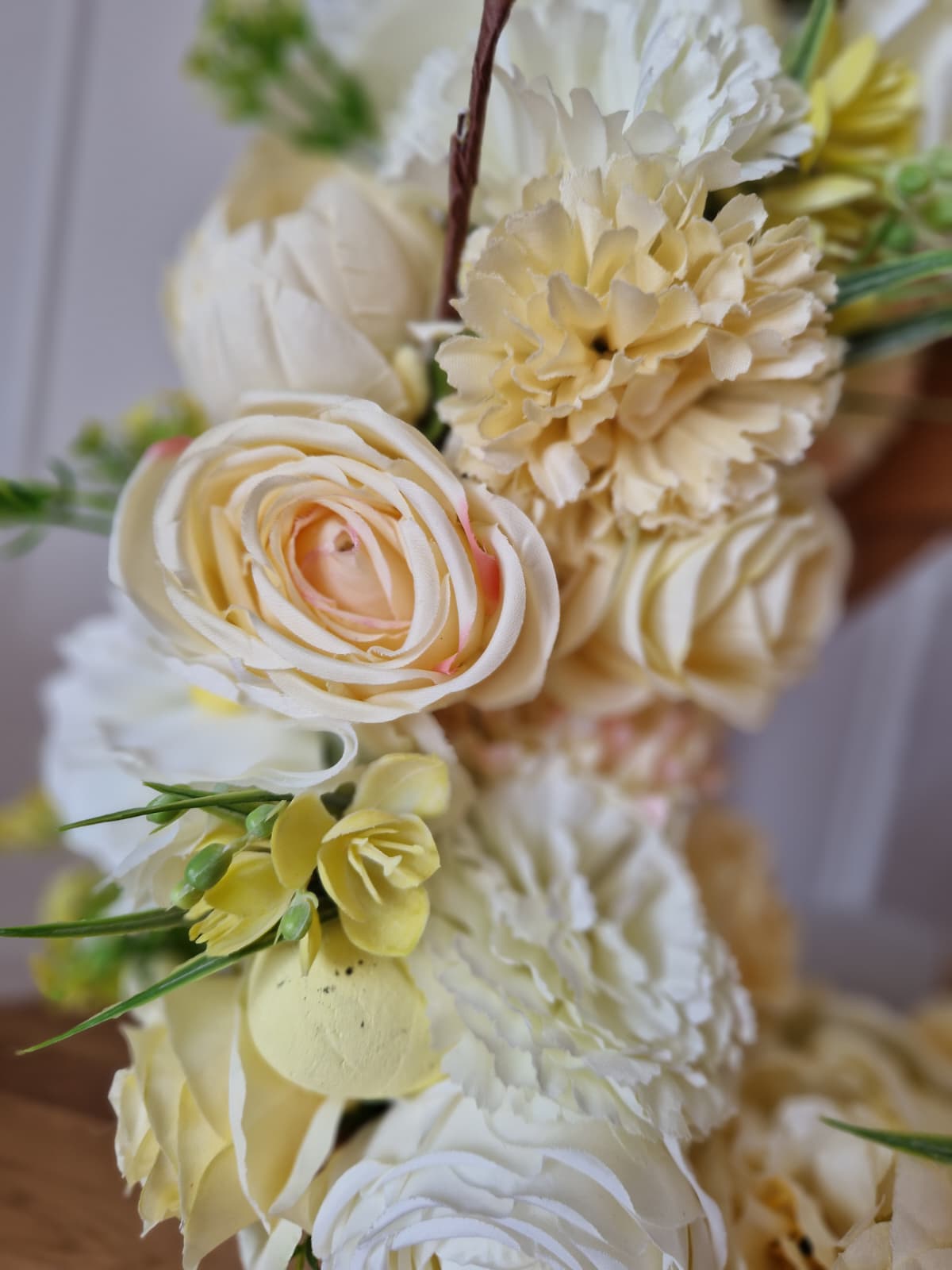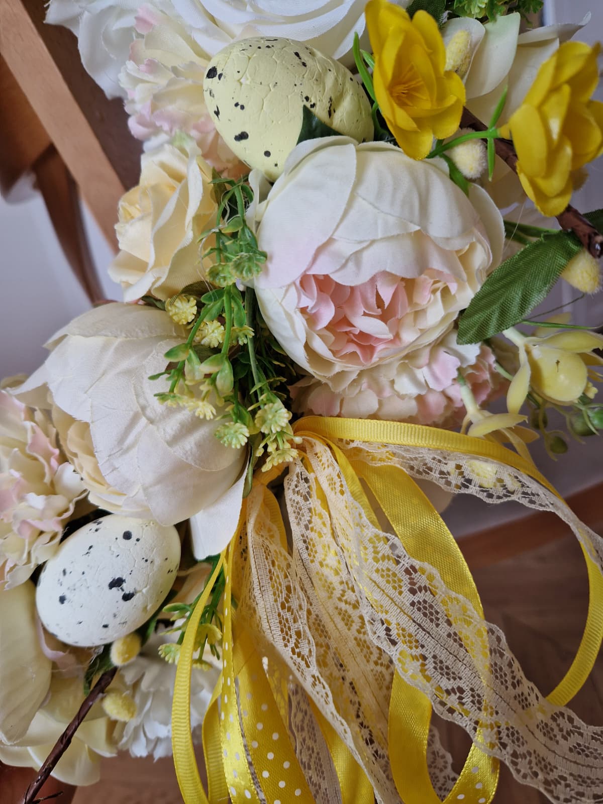 Świąteczny wieniec w całości wykonany ręcznie z dbałością o detale, niepowtarzalny, duży wianek wiosenny, wiklinowy, kwiatowy w odcieniach pastelowego żółtego i kremowego. Wianek jest bardzo oryginalny i jedyny w swoim rodzaju, zawieszony na drzwiach wejściowych powita gości serdecznie, a powieszony wewnątrz wniesie do wnętrza odrobinę klimatu Wielkanocnych Świąt.
