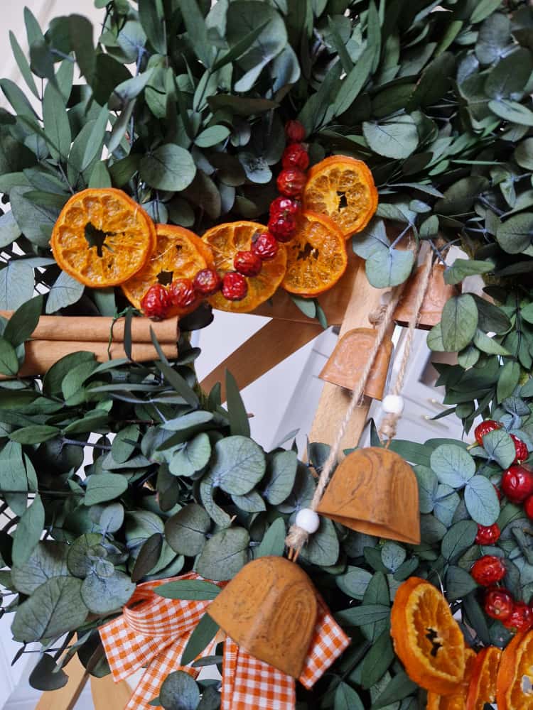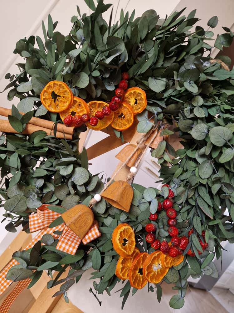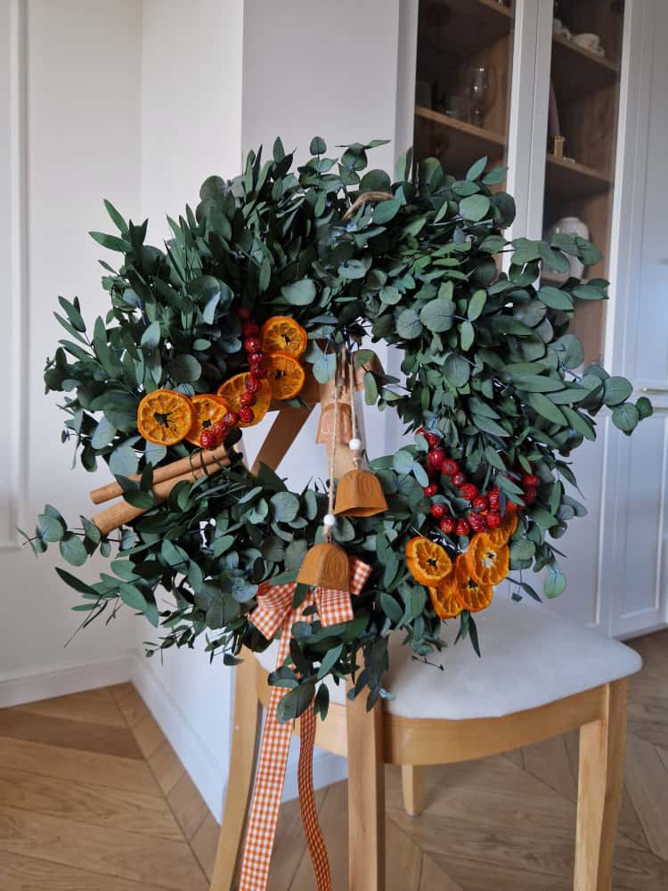 Ten wianek to kwintesencja naturalnego uroku i świątecznego ciepła. Ręcznie wykonany ze stabilizowanego eukaliptusa, udekorowany suszoną mandarynką, owocami dzikiej róży i laskami cynamonu – wprowadzi do wnętrza przytulny, zimowy klimat.