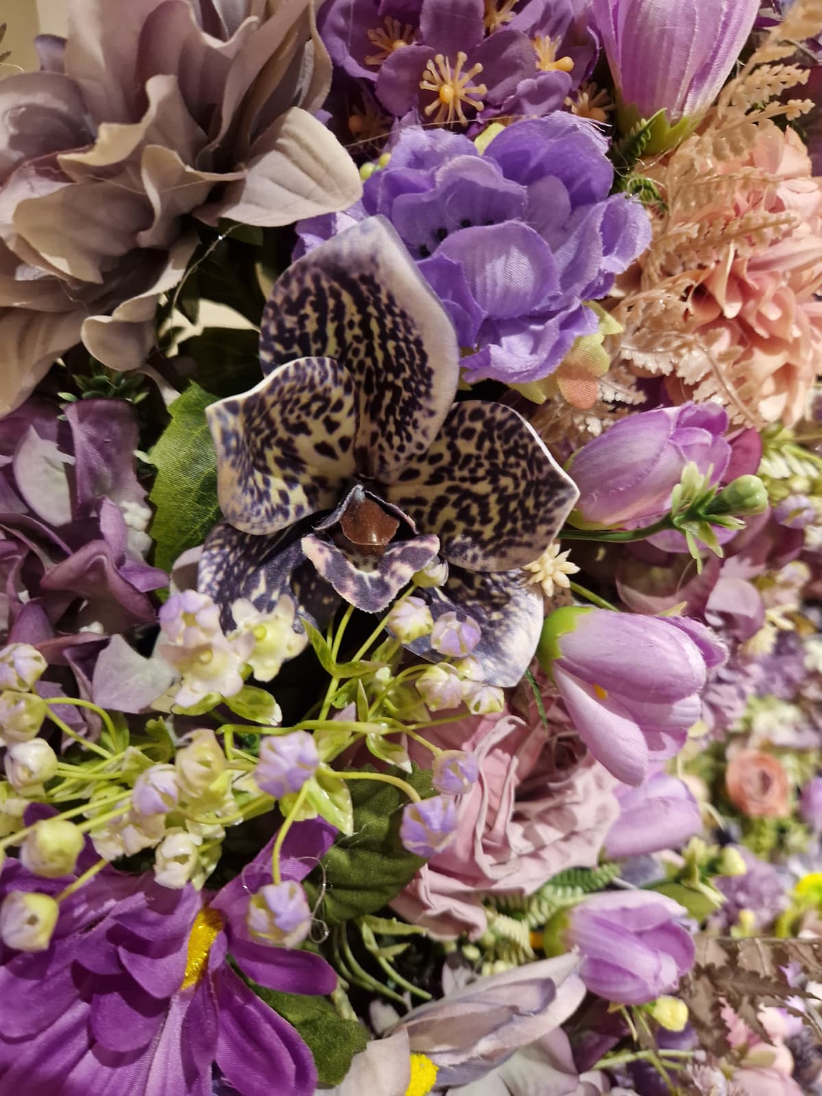 Ten wieniec to wyjątkowa kompozycja w odcieniach pudrowego różu, lawendy i głębokiego fioletu, która przyciąga wzrok swoją bogatą formą i subtelną elegancją. Gęsto ułożone kwiaty - róże, dalie, hortensje i drobne akcenty polnych roślin, tworzą harmonijną, pełną detali całość.