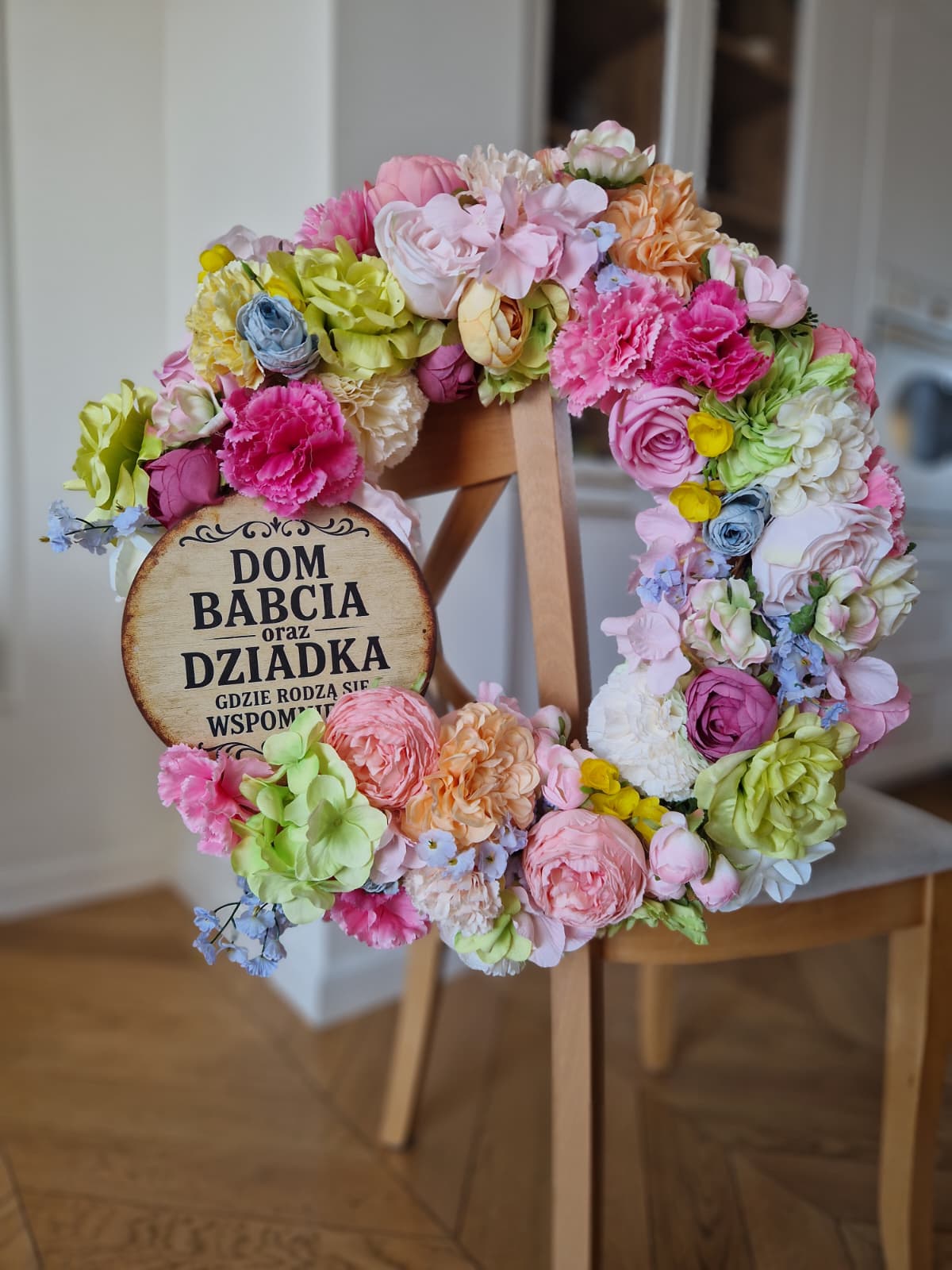 Bogato zdobiony, duży, pastelowy wianek wiosenny, wiklinowy, kwiatowy, wykonany ręcznie ze sztucznych kwiatów i dodatków wysokiej jakości. Piękny prezent dla ukochanych Dziadków, który wprowadzi do wnętrza przytulną atmosferę i podkreśli wartość rodzinnych chwil.