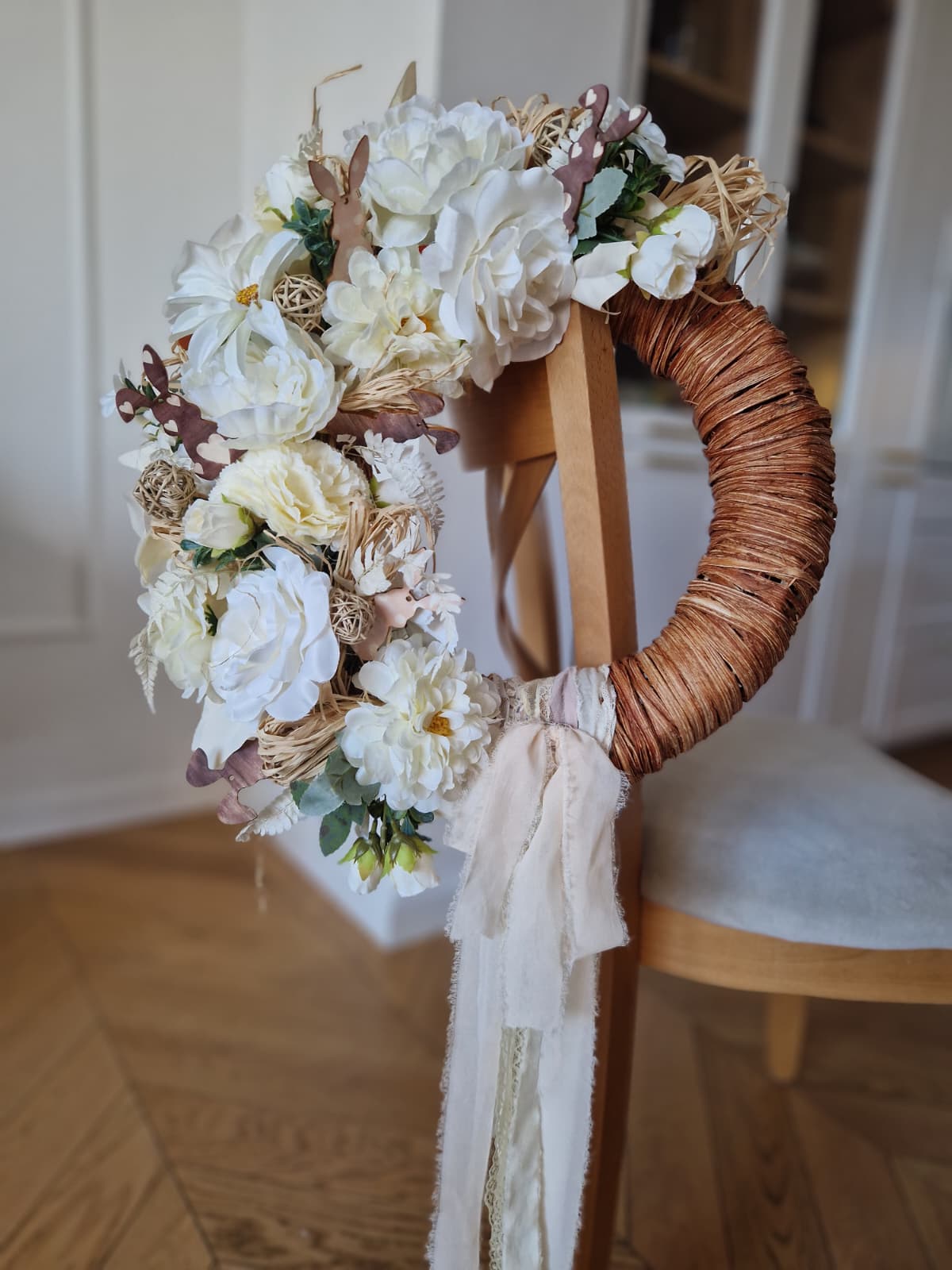 Świąteczny wieniec w całości wykonany ręcznie z dbałością o detale, niepowtarzalny, duży wianek wiosenny, wielkanocny, kwiatowy w odcieniach pastelowego kremowego, beżu i bieli. Wianek jest bardzo oryginalny i jedyny w swoim rodzaju, zawieszony na drzwiach wejściowych powita gości serdecznie, a powieszony wewnątrz wniesie do wnętrza odrobinę klimatu Wielkanocnych Świąt.