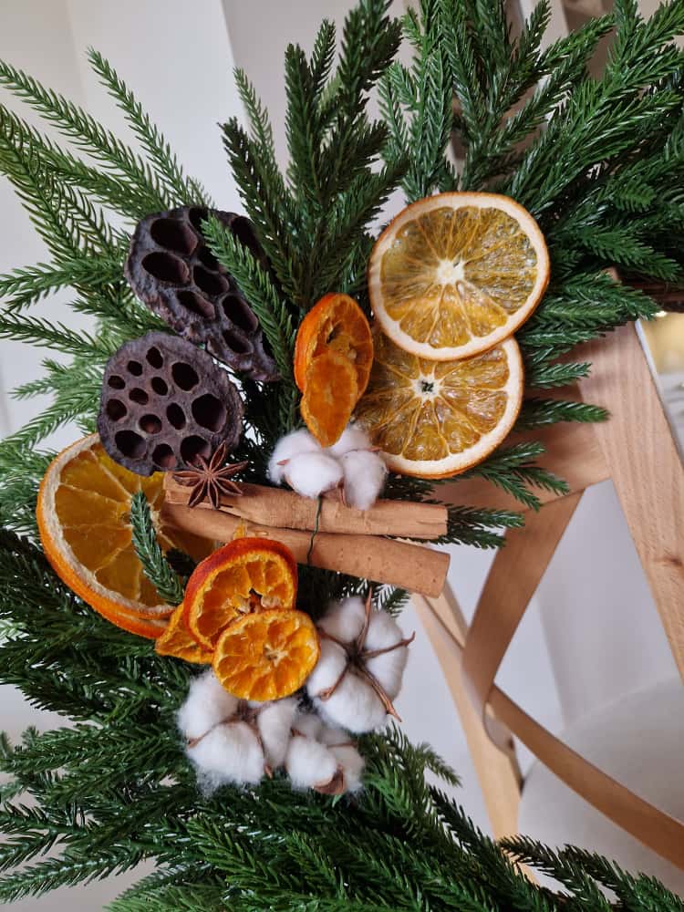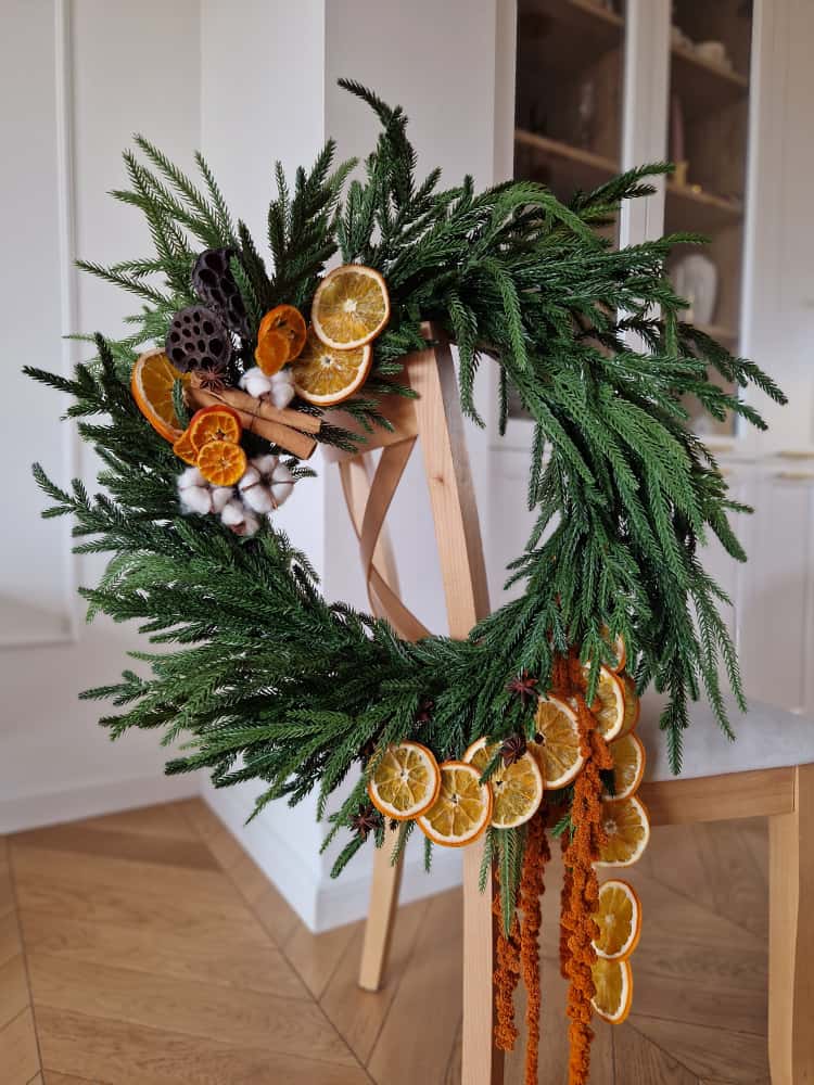 Duży wieniec świąteczny, zimowy wykonany z gałązek wysokiej jakości silikonu, o naturalnym wyglądzie, dekoracyjnymi kwiatami bawełny, amarantusa, świeżo suszonymi cytrusami i laskami cynamonu.