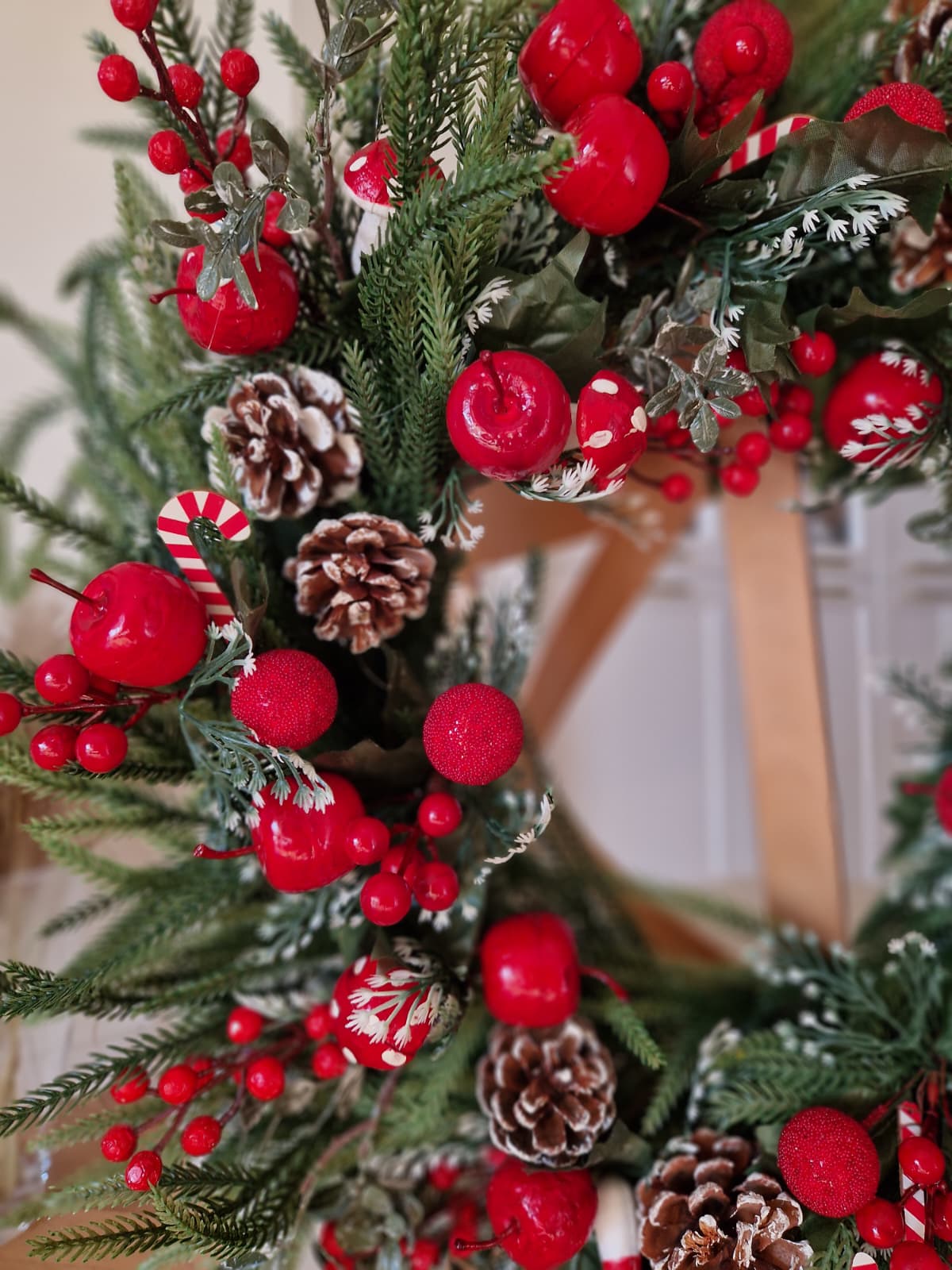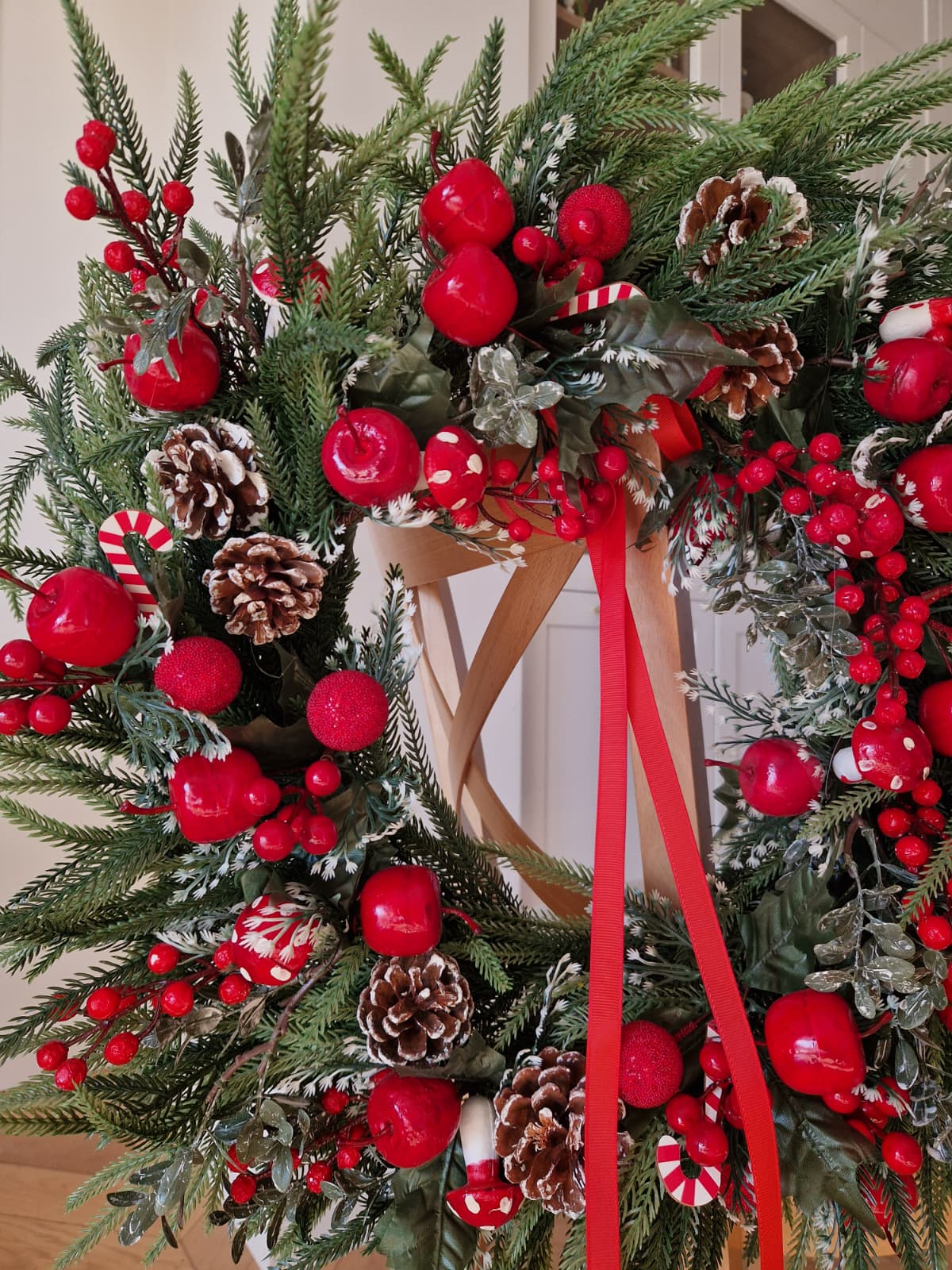 Materiał: Metalowa obręcz, sztuczne zielone gałązki, dekoracyjne gałązki, ozdoby, szyszki i tasiemka.