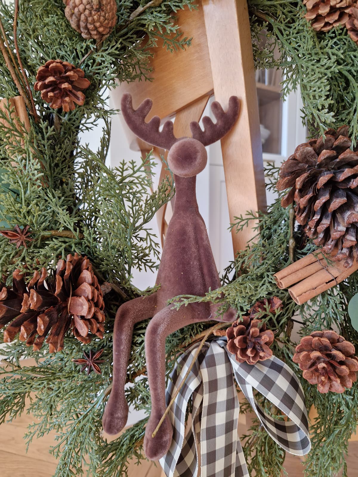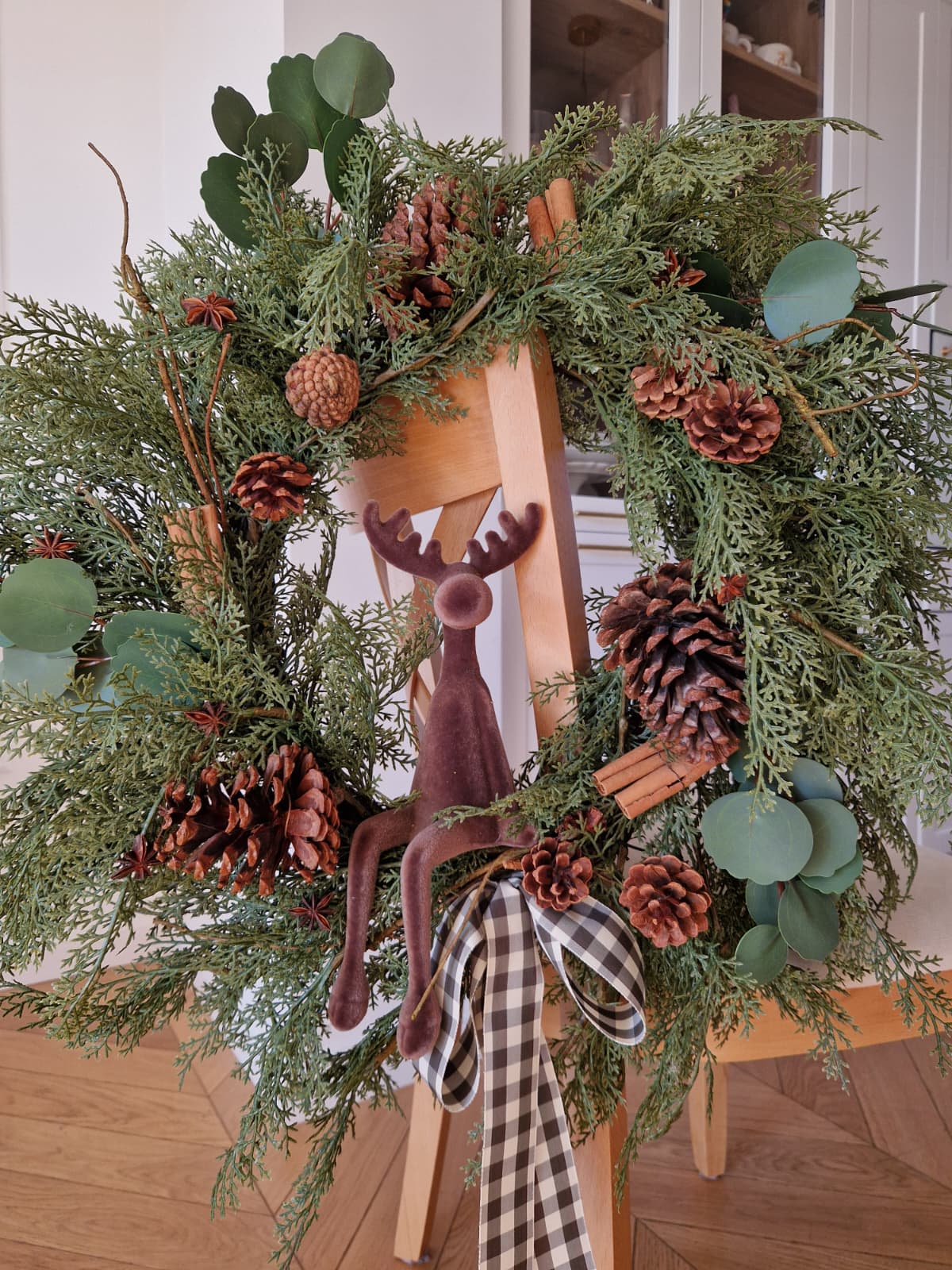 Materiał: Wiklina, sztuczne silikonowe, zielone gałązki, dekoracyjne gałązki, laski cynamonu, flokowany renifer, szyszki i tasiemka.